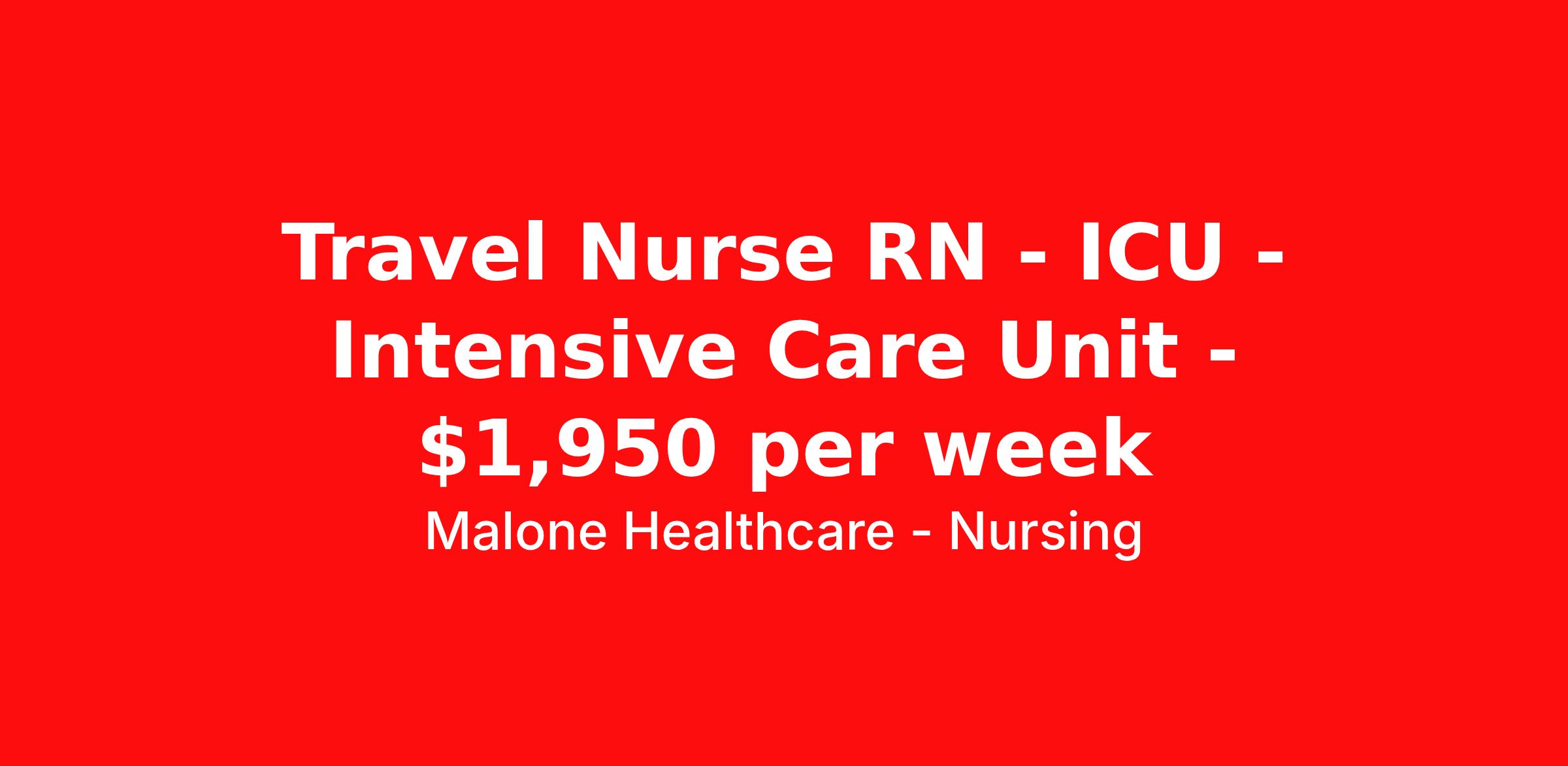 Malone Healthcare - Nursing is seeking a travel nurse RN ICU - Intensive Care Unit for a travel nursing job in Richmond Heights, Ohio. Job Description & Requirements Specialty: ICU - Intensive Care Unit Discipline: RN Start Date: 03/30/2026 Duration: 13 weeks 36 hours per week Shift: 12 hours, nights Employment Type: Travel About Malone Healthcare - Nursing With a commitment to providing a higher standard of service and experience in patient care, Malone Healthcare places expert nurses and allied health professionals in rewarding careers throughout the United States. As a leading healthcare staffing agency, Malone’s focus on compliance and integrity translates to a seamless experience for our team members and partner facilities. When you work with Malone Healthcare, you can rely on over 50 years of proven experience placing exceptional professionals in quality healthcare settings. Benefits Weekly pay Holiday Pay Guaranteed Hours Continuing Education 401k retirement plan Pet insurance Referral bonus Medical benefits Dental benefits Vision benefits License and certification reimbursement Life insurance