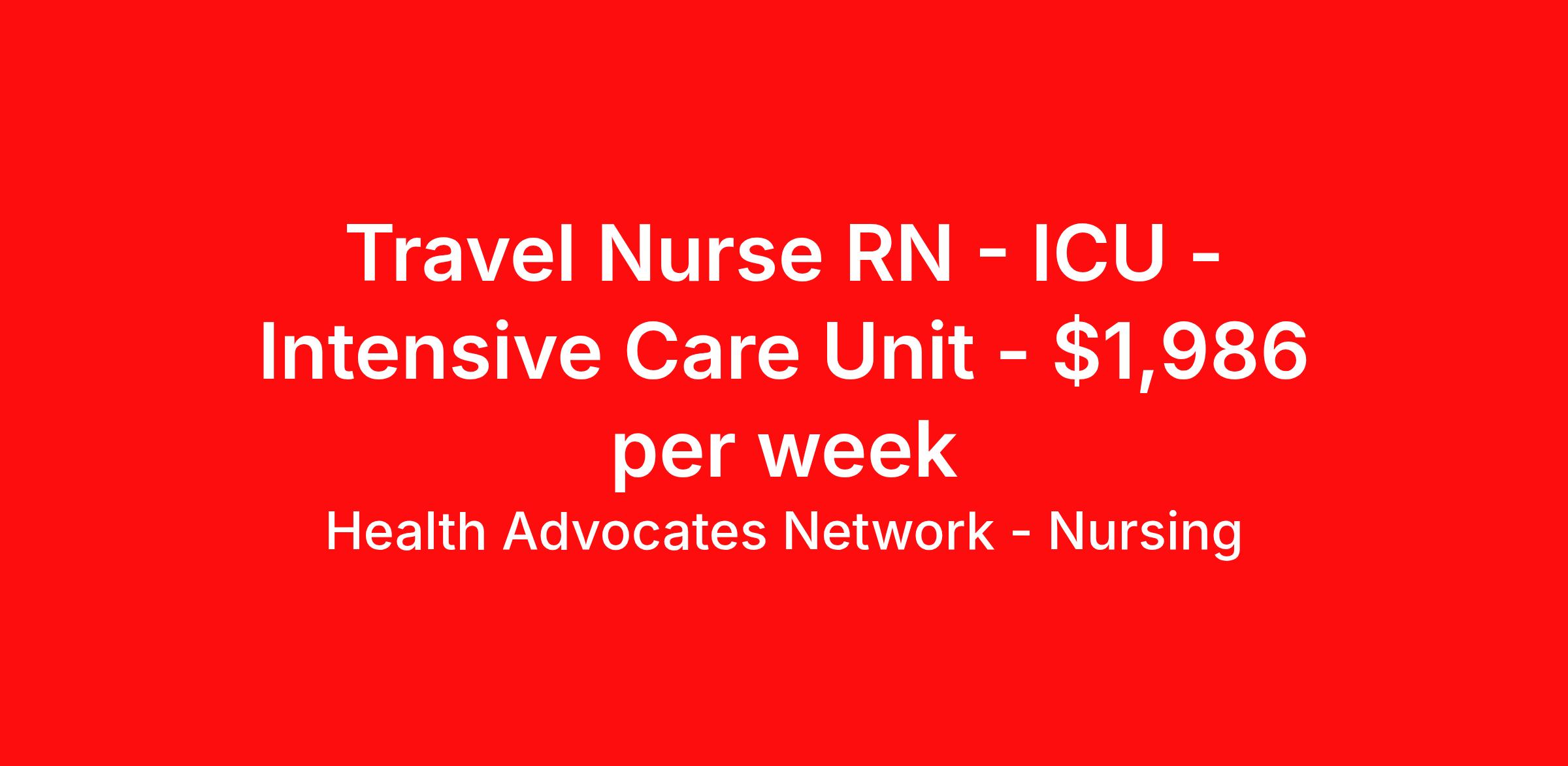 Health Advocates Network - Nursing is seeking a travel nurse RN ICU - Intensive Care Unit for a travel nursing job in Laurinburg, North Carolina. Job Description & Requirements Specialty: ICU - Intensive Care Unit Discipline: RN Start Date: 04/13/2026 Duration: 13 weeks 36 hours per week Shift: 12 hours, nights Employment Type: Travel RN – ICU Registered Nurse - Health Advocates Network is urgently hiring ICU RNs with at least 2 years of recent experience! IMMEDIATE STARTS! Travel packages up to $1,986 weekly 12HR NIGHT shifts available 13 week contracts available Specialty: ICU Registered Nurse (RN) Requirements: Active NC State or Compact Registered Nurse License if applicable ACLS, BLS, NIHSS Graduate of an Accredited School of Nursing Additional certifications may be required Benefits We Offer: Competitive pay rates, Referral Bonus, Medical, Dental and Vision. Travel reimbursement and per diem allowances, Employee discounts, educational opportunities, and more! To apply for this job now or to find out more about other opportunities with Health Advocates Network, Inc. reply to this posting, contact us at or call/text . We can provide you unparalleled access to exciting career opportunities. Health Advocates Network, Inc . is an equal opportunity employer. All qualified applicants shall receive consideration for employment without regard to any legally protected basis protected by applicable federal or state law except where a bona fide occupational qualification applies. Refer a Registered Nurse for a $1,000.00 bonus opportunity! HANStaff Job ID 523522. Pay package is based on 12 hour shifts and 36 hours per week (subject to confirmation) with tax-free stipend amount to be determined. Posted job title: RN - ICU About Health Advocates Network - Nursing Health Advocates Network was founded on the basis of a shared aspiration, to improve the way healthcare staffing is done. We are a company established and led by nurses. Our flexible approach enables us to develop solutions customized to your specific needs. From short- and long-term travel contracts to local and per diem assignments and more, we are here to get you to your next adventure! By solving challenges, providing the best placements, and advocating for you, we stand to help you thrive and pave the path forward in your career. Click on the videos below to learn more about our values!