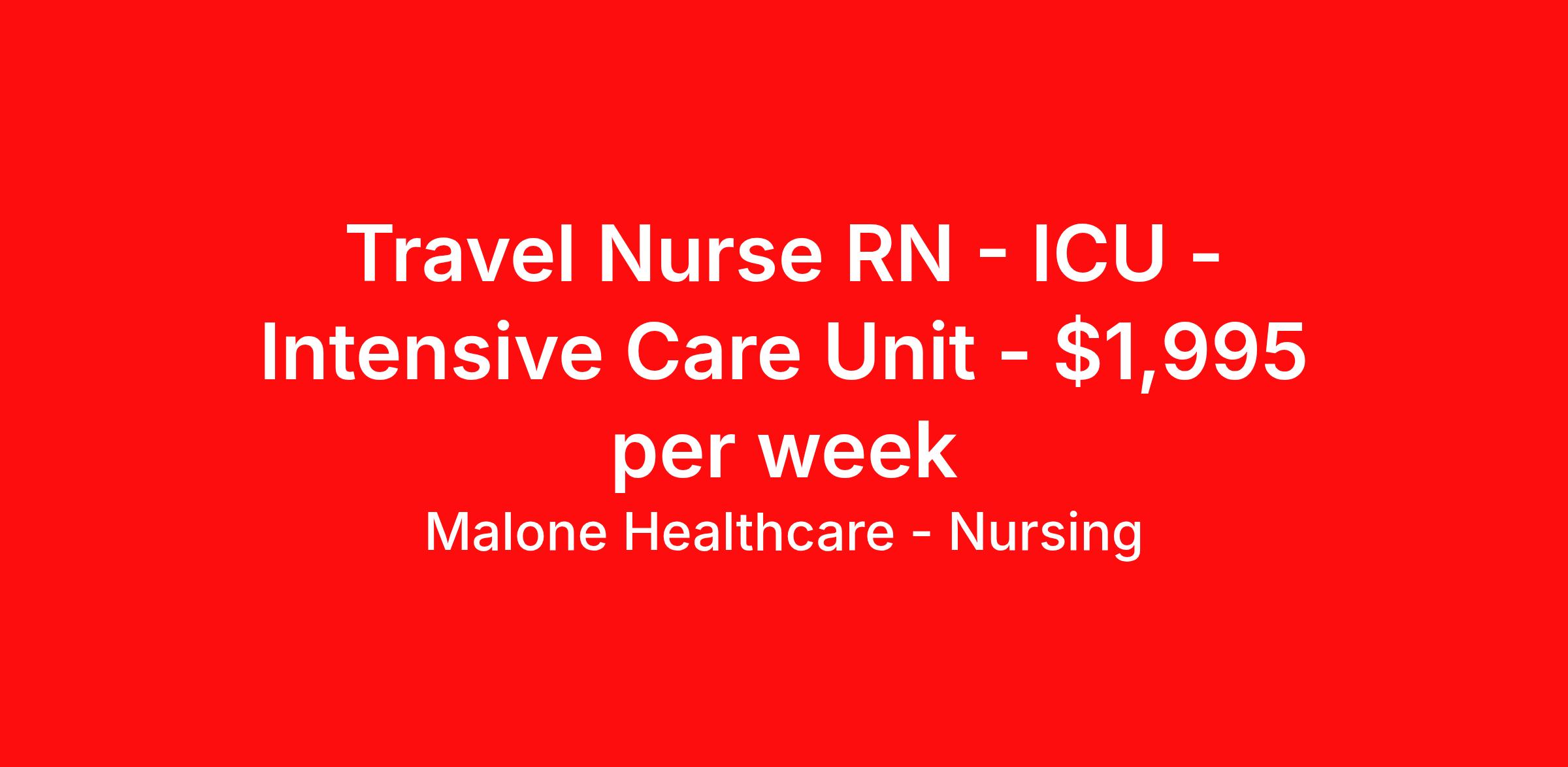 Malone Healthcare - Nursing is seeking a travel nurse RN ICU - Intensive Care Unit for a travel nursing job in Painesville, Ohio. Job Description & Requirements Specialty: ICU - Intensive Care Unit Discipline: RN Start Date: 04/14/2026 Duration: 13 weeks 36 hours per week Shift: 12 hours, nights, flexible Employment Type: Travel About Malone Healthcare - Nursing With a commitment to providing a higher standard of service and experience in patient care, Malone Healthcare places expert nurses and allied health professionals in rewarding careers throughout the United States. As a leading healthcare staffing agency, Malone’s focus on compliance and integrity translates to a seamless experience for our team members and partner facilities. When you work with Malone Healthcare, you can rely on over 50 years of proven experience placing exceptional professionals in quality healthcare settings. Benefits Weekly pay Holiday Pay Guaranteed Hours Continuing Education 401k retirement plan Pet insurance Referral bonus Medical benefits Dental benefits Vision benefits License and certification reimbursement Life insurance