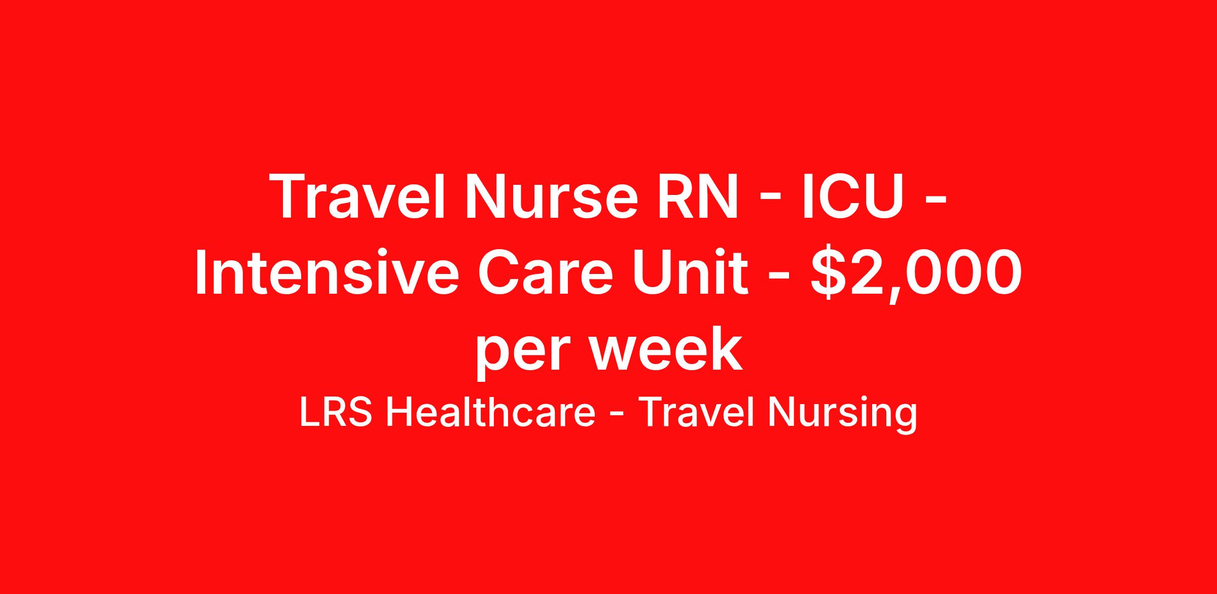 LRS Healthcare - Travel Nursing is seeking a travel nurse RN ICU - Intensive Care Unit for a travel nursing job in Rocky Ford, Colorado. Job Description & Requirements Specialty: ICU - Intensive Care Unit Discipline: RN Duration: 13 weeks 36 hours per week Shift: 12 hours, nights Employment Type: Travel LRS Healthcare - Travel Nursing Job ID 031826-P. Pay package is based on 12 hour shifts and 36 hours per week (subject to confirmation) with tax-free stipend amount to be determined. About LRS Healthcare - Travel Nursing LRS Healthcare can lend a hand to take your career to new heights and places. As an industry leader in healthcare staffing, we work to connect you with jobs at top of the line facilities in the locations you’ve always wanted to live and visit. LRS is truly a full service medical staffing agency, so we take care of everything from housing and travel expenses to your itinerary, too. We handle it all because we want to be with you throughout your journey – not just your next placement. As a medical staffing agency that fosters long relationships with their employees, we’re determined to help amplify your personal and career growth through placement. We identify both temporary and permanent positions for candidates, and even some temp-to-perm positions that begin as 13-week programs. We have many positions available across the country, so let's discuss what would be a good fit for you! Benefits: Medical, Dental, and Vision Short-Term Disability Long-Term Disability Life Insurance 401(k) Certification & License Reimbursement Refer-a-friend Bonus Program Direct Deposit - Weekly 24-Hour Support Benefits Medical benefits Life insurance 401k retirement plan License and certification reimbursement Referral bonus Weekly pay