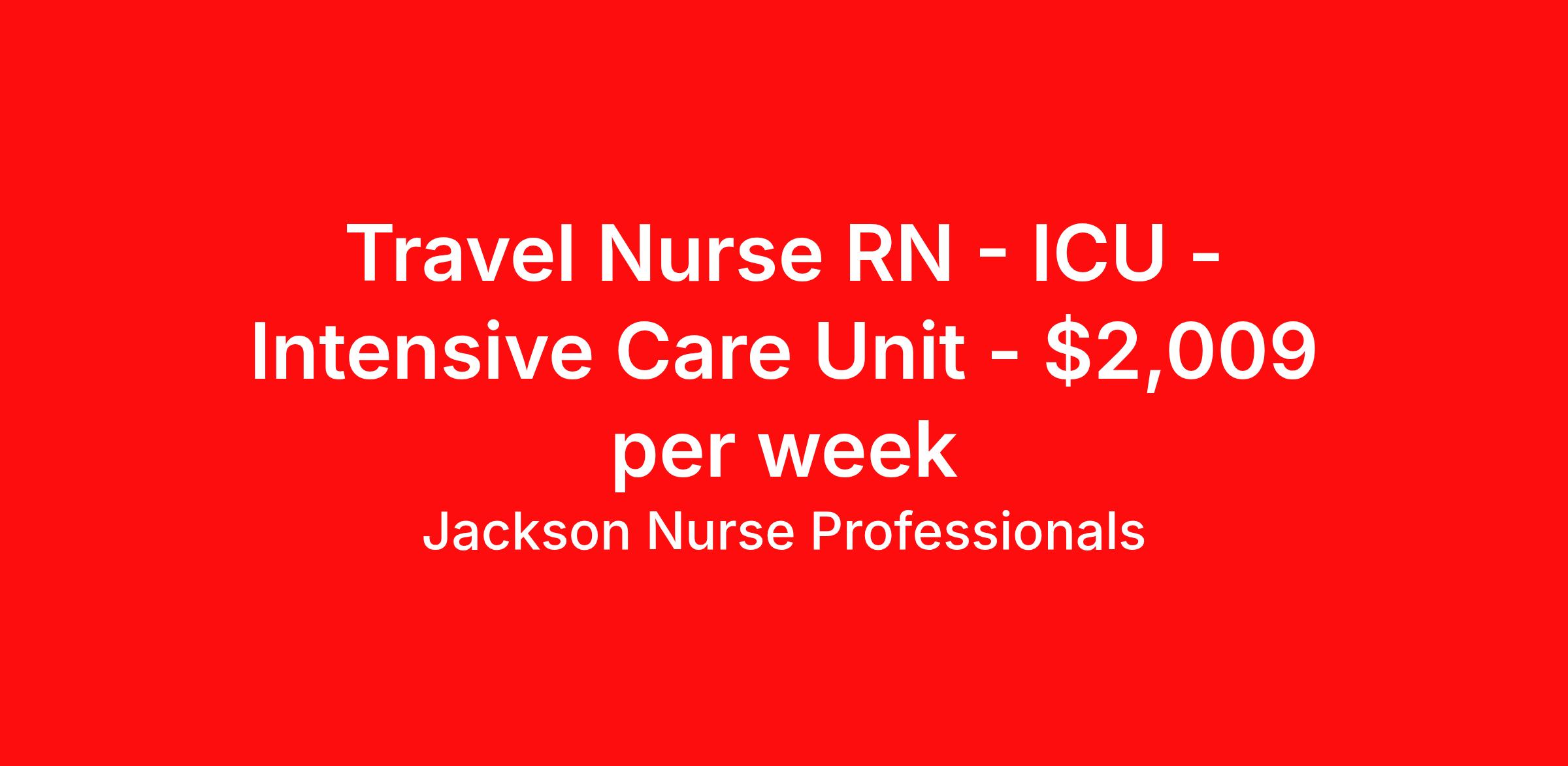 Jackson Nurse Professionals is seeking a travel nurse RN ICU - Intensive Care Unit for a travel nursing job in Greenville, Mississippi. Job Description & Requirements Specialty: ICU - Intensive Care Unit Discipline: RN Start Date: ASAP Duration: 13 weeks 36 hours per week Shift: 12 hours, nights Employment Type: Travel About Jackson Nurse Professionals Filling critical needs in patient care, Jackson Nurse Professionals delivers cost-effective travel nurse staffing solutions to over 500 hospitals, outpatient clinics, and home health clients nationwide. Awarded Best of Staffing - Talent and Client 2024, and rated as a Top Workplace 2023 by the Orlando Sentinel, Jackson Nurse Professionals goes the extra mile to provide travel nurses the career they deserve, while providing clients with a large range of highly skilled nurses to fill short, long-term, and temporary assignments. As a member of Jackson Healthcare’s family of award-winning staffing companies, we’re part of a growing community that’s impacting 10 million patients nationwide. Join our mission to improve the delivery of patient care, and the lives of everyone we touch.