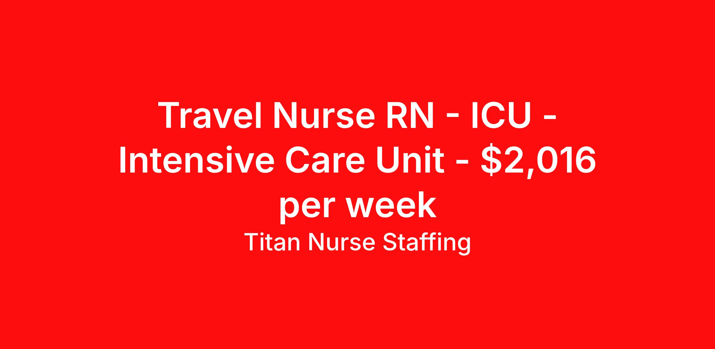 Titan Nurse Staffing is seeking a travel nurse RN ICU - Intensive Care Unit for a travel nursing job in Fairport Harbor, Ohio. Job Description & Requirements Specialty: ICU - Intensive Care Unit Discipline: RN Start Date: ASAP Duration: 13 weeks 36 hours per week Shift: 12 hours, nights Employment Type: Travel Health care professional needed for an ICU position in OH. Must have a minimum of 2 years experience as an ICU RN. We offer our clients the best in traveling medical professionals. The only way we can attract and maintain a good relationship with those professionals is to keep their best interests in mind. After all, our success relies on your success. That’s why we always put your best interests in mind — from superior placements to finding great living accommodations and negotiating a fair price to providing the tools you need for success. Titan Medical is one of the top medical staffing agencies because we provide superior support to our travelers every step of the way. About Titan Nurse Staffing We Take Care of You. While the availability of medical technicians and professionals becomes increasingly limited, there seems to be no shortage of staffing firms. That’s why Titan Medical works hard to distinguish itself through our responsiveness, our candidates and our attentiveness to your individual needs. When we say, “We take care of you.” We mean it – both to the medical professionals we represent and the healthcare organizations that rely on us for quality candidates. Founded by experienced medical professional recruiters and healthcare human resource professionals, Titan Medical was created as an alternative to other staffing resources. We found that by focusing on the needs of the individuals we served, we were able to attract higher quality candidates and clients in need of their services. It’s a risk that paid off, making Titan Medical one of the leading medical professional staffing firms in the country. Our candidates include the very best in the fields of radiation oncology, rehabilitation, respiratory care, radiology services, nursing and medical laboratory have to offer. Our clients represent the broad diversity of the healthcare industry today – from leading national and regional healthcare centers to traditional hospitals, specialty care clinics and other centers of care.