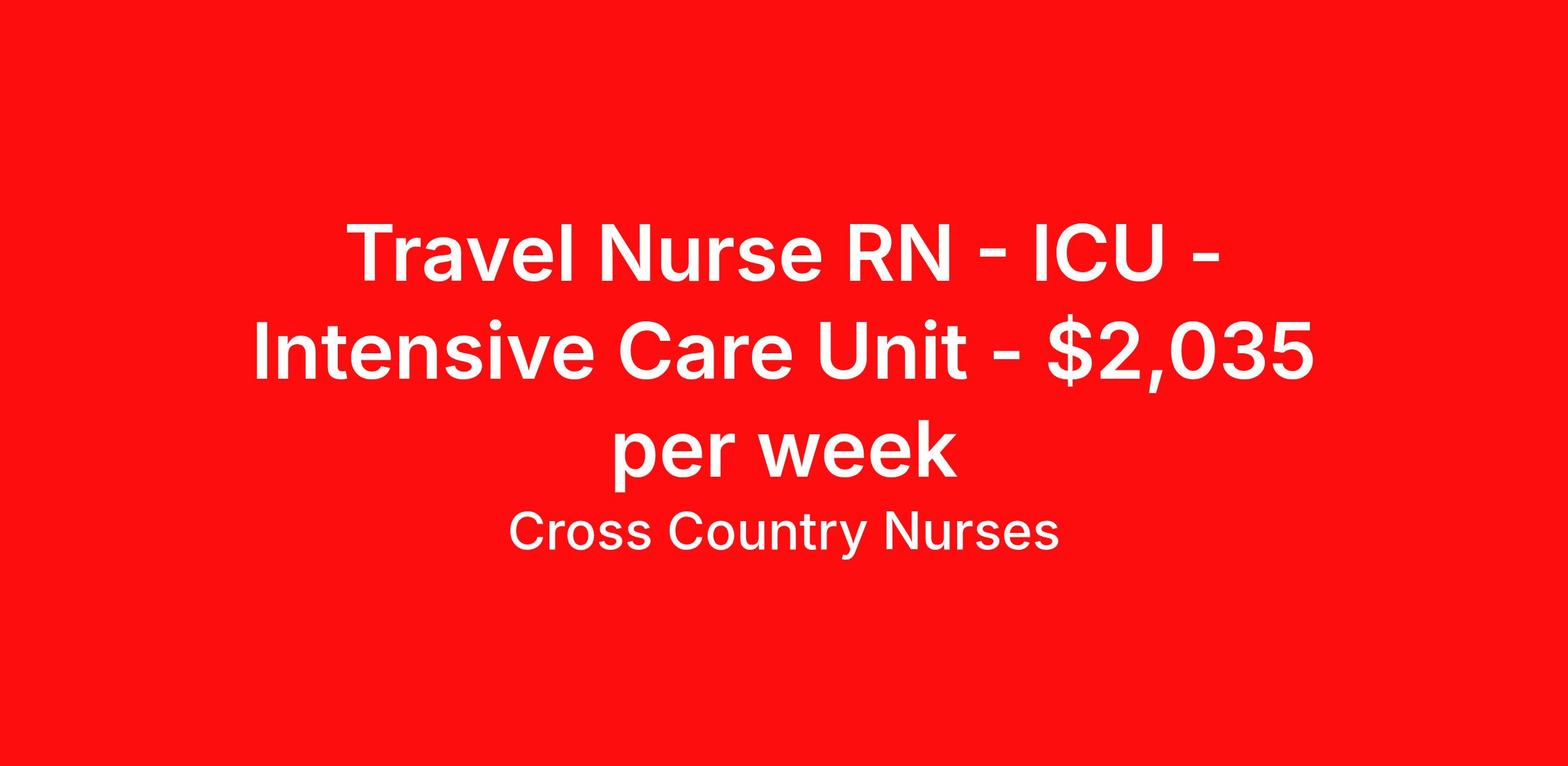 Cross Country Nurses is seeking a travel nurse RN ICU - Intensive Care Unit for a travel nursing job in Manchester, Connecticut. Job Description & Requirements Specialty: ICU - Intensive Care Unit Discipline: RN Start Date: 04/20/2026 Duration: 13 weeks 36 hours per week Shift: 12 hours, nights Employment Type: Travel Job Description As an intensive care unit nurse (RN ICU), you will be monitoring patients with highly unstable, life-threatening conditions, to ensure they receive the best possible care. You must be able to rapidly assess a patient's condition and intervene with the appropriate care, managing various life-support systems like ventilation and heart-monitoring. Additionally, you will extend emotional support and education to gravely ill patients and their families. Minimum Requirements At least 1 year of recent acute care experience in specialty Active RN license Benefits The benefits of taking a travel nursing job with Cross Country include: Private housing or generous housing allowance Comprehensive health insurance with prescription coverage Dependent health insurance with prescription coverage Competitive salaries Referral bonuses Travel reimbursement 401(k) retirement plan Direct deposit/free checking Unlimited free CE credits Cross Country Job ID 1228987. Pay package is based on 12 hour shifts and 36 hours per week (subject to confirmation) with tax-free stipend amount to be determined. Posted job title: Registered Nurse / Intensive Care Unit About Cross Country Nurses You care for others — we’re here to care for you. At Cross Country, we know travel nursing is about more than just the job. It’s about building a career that supports your lifestyle, your values, and your impact. We offer competitive pay, full benefits, and 24/7 support from a team that truly understands what it means to be on the front lines. Wherever your journey takes you, we’re with you every step of the way. Let’s build your best life — one assignment at a time. Benefits 401k retirement plan Referral bonus