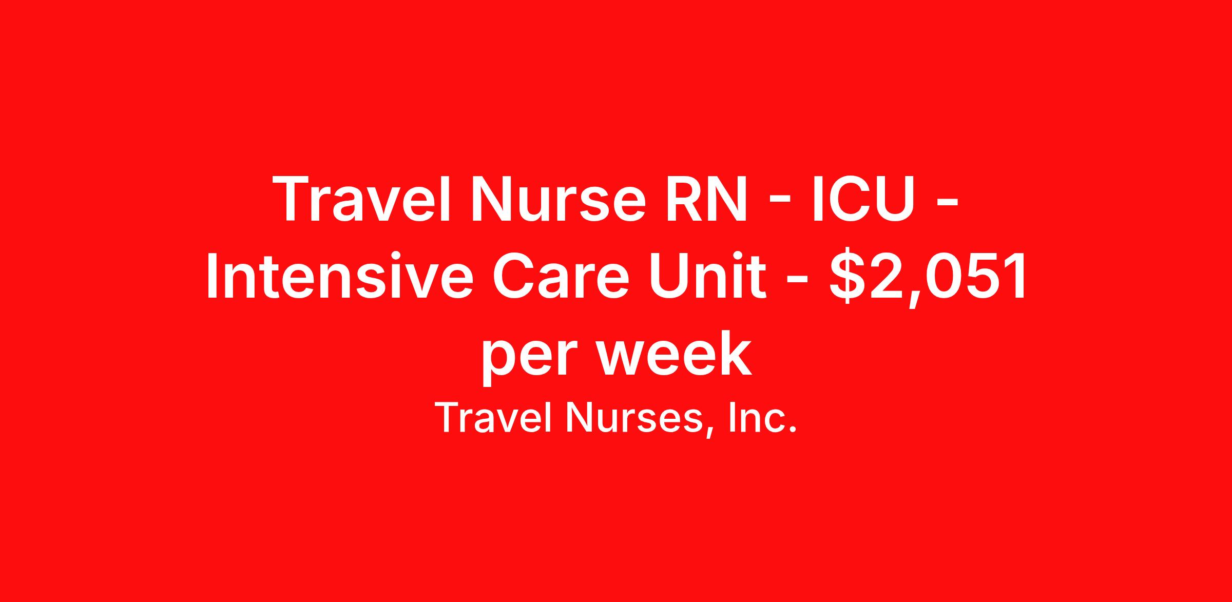 Travel Nurses, Inc. is seeking a travel nurse RN ICU - Intensive Care Unit for a travel nursing job in Prescott Valley, Arizona. Job Description & Requirements Specialty: ICU - Intensive Care Unit Discipline: RN Start Date: 04/06/2026 Duration: 13 weeks 36 hours per week Shift: 12 hours Employment Type: Travel Travel Nurses, Inc. Job ID 307013. Pay package is based on 12 hour shifts and 36 hours per week (subject to confirmation) with tax-free stipend amount to be determined. Posted job title: RN (Registered Nurse) About Travel Nurses, Inc. Travel Nurses, Inc. is a leading healthcare staffing agency that provides healthcare professionals with opportunities to work across the country. Founded by nurses in 1988, TNI has more than 30 years of experience in the industry. The agency initially focused on staffing operating room settings in the MidSouth. However, this quickly evolved to encompass all nursing specialties and allied health fields nationwide. At the heart of our mission is a profound respect for nurses, whom we consider the cornerstone of healthcare. This acknowledgment extends beyond the nursing profession alone. Travel Nurses, Inc. now proudly embraces a wide array of healthcare professionals, recognizing their crucial roles in our collective mission. Travel Nurses, Inc. is dedicated to providing comprehensive support and opportunities that will help facilitate complete career mobility in the healthcare field. Our commitment to transparency ensures that all professionals, not just nurses, can confidently accept any assignment without financial uncertainties. We prioritize our professionals’ well-being with comprehensive benefits packages, including day-one healthcare coverage, competitive salaries, bonuses and incentives. This underscores our unwavering commitment to offering the best possible rewards and support for all the professionals we serve. Benefits Weekly pay Continuing Education 401k retirement plan Wellness and fitness programs Mileage reimbursement Referral bonus Employee assistance programs Medical benefits Dental benefits Vision benefits Benefits start day 1 License and certification reimbursement Life insurance Retention bonus