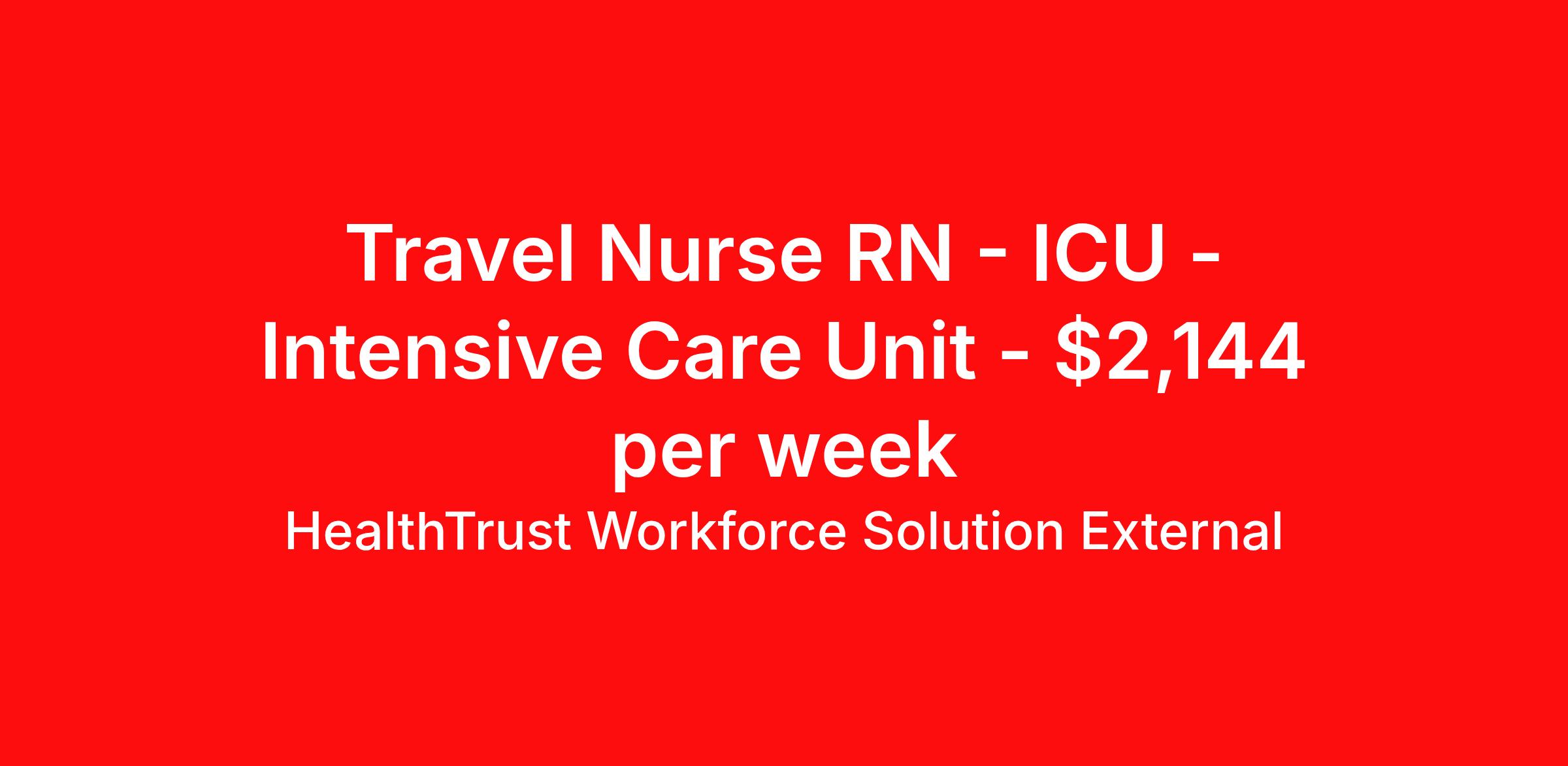 HealthTrust Workforce Solution External is seeking a travel nurse RN ICU - Intensive Care Unit for a travel nursing job in Gadsden, Alabama. Job Description & Requirements Specialty: ICU - Intensive Care Unit Discipline: RN Start Date: 04/20/2026 Duration: 13 weeks 36 hours per week Shift: 12 hours, nights Employment Type: Travel Travel RN- ICU Start Date: ASAP Duration: 13wks Shift: Nights (7p-7a), every other weekend required Required: Active AL or Multistate license (no prior NURSYS hits), ACLS, BLS, 2yrs ICU RN exp. Must live 50mi from facility. Experience with vented patients, vasoactive drips. Cerner exp preferred General Comments