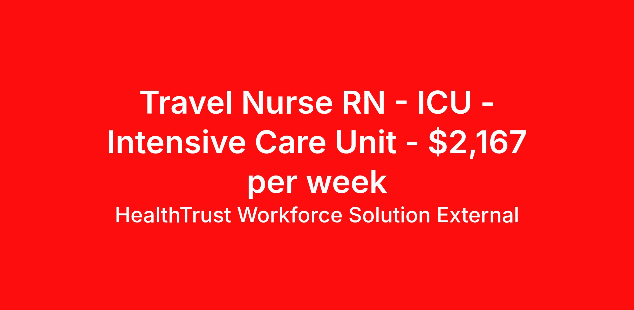 HealthTrust Workforce Solution External is seeking a travel nurse RN ICU - Intensive Care Unit for a travel nursing job in Birmingham, Alabama. Job Description & Requirements Specialty: ICU - Intensive Care Unit Discipline: RN Start Date: 04/20/2026 Duration: 13 weeks 36 hours per week Shift: 12 hours, nights Employment Type: Travel • Shift: 3X12, Nights, 18:30 - 07:00 • Weekly Guaranteed Hours: 36 Hours • Weekend Hours: Every Other Weekend • Call Requirements: None • Required Certifications: ACLS, BLS, NIH (All AHA) • Years of Experience: 2 • Float Requirements: Any ICU, including to facilities within a 25 mile radius Unit Information: • Number of Beds: 12 • Patient Ratios: 2:1 • Equipment: • EMR: Hiring Profile: • Must Have Skills/Experience: ICU experience • Preferred Skillset/Experience: • Type of Patients on Unit: Surgical, Vascular, ICU patients