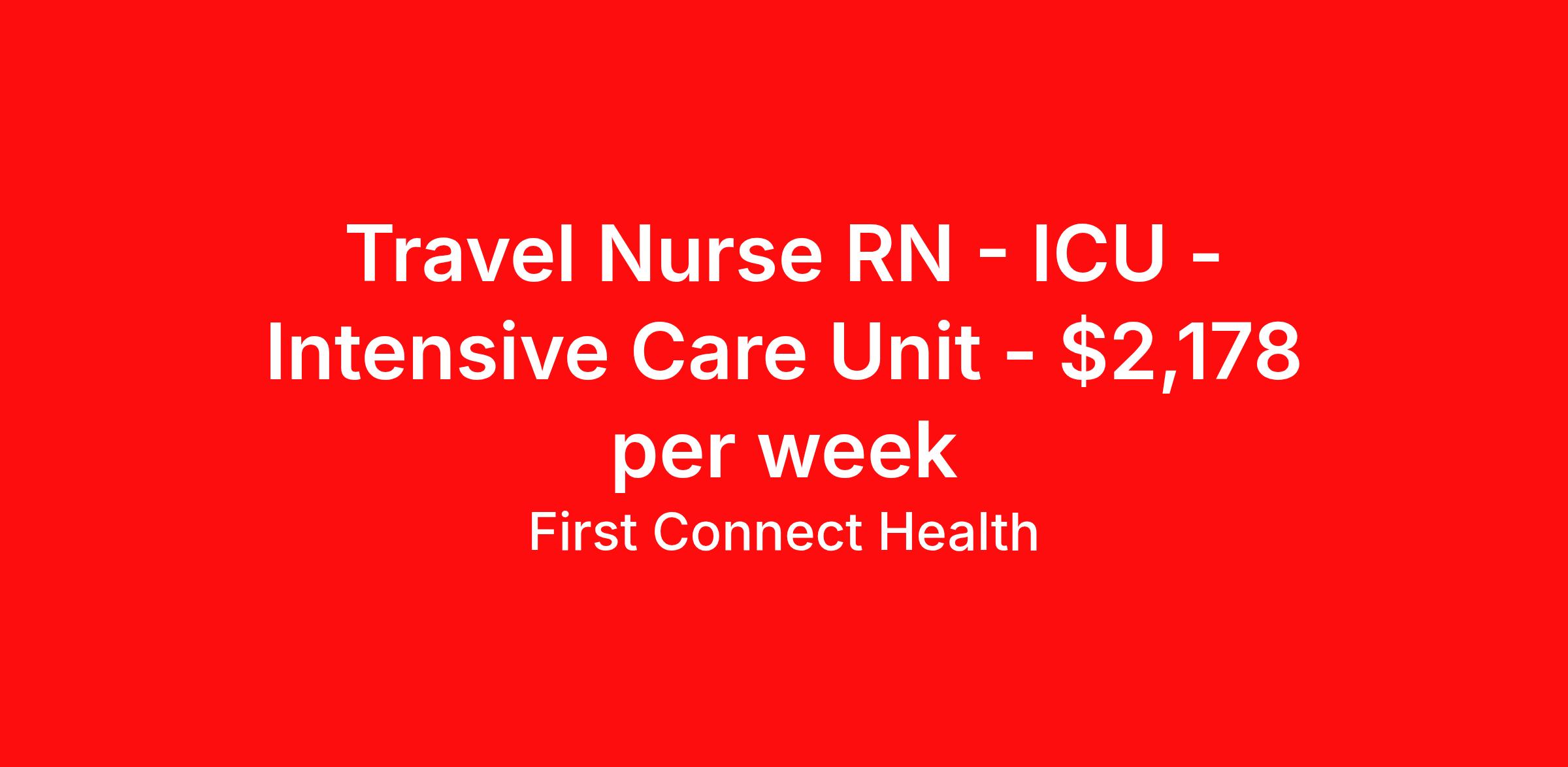 First Connect Health is seeking a travel nurse RN ICU - Intensive Care Unit for a travel nursing job in Sonora, California. Job Description & Requirements Specialty: ICU - Intensive Care Unit Discipline: RN Start Date: 04/20/2026 Duration: 13 weeks 36 hours per week Shift: 12 hours, nights Employment Type: Travel Title: RN ICU Location: Sonora, CA 95370 Duration: 13 Weeks Shift: Nights (12*3) Requirements: Night Shift/36 hours/CCRN is a MUST Education and Work Experience: Bachelor's Degree in Nursing (BSN): Preferred Acute care facility experience: Preferred Licenses/Certifications: Registered Nurse (RN) licensure in the state of practice: Required Cardiopulmonary Resuscitation (CPR) or Basic Life Support (BLS OR HS-BLS OR RQIBLS) certification: Required Department Specific License/Certifications: ACLS (Advanced Cardiovascular Life Support): Required Pediatric Advanced Life Support (PALS) or Healthstream Pediatric Advanced Life Support (HS-PALS) or RQIPALS: Required Description: Delivers coordinated nursing care for a patient or an assigned group of patients according to established standards of care and the nursing process. Supervises and directs the activities of various levels of assigned nursing staff, and coordinates care with other disciplines while utilizing critical thinking, professional and supervisory discretion, and independent judgment. Orientation Paid. 36004 About First Connect Health At First Connect Health , we take pride in being a Joint Commission–certified healthcare staffing agency , headquartered in Newark, New Jersey. This prestigious certification is more than just a seal — it's a reflection of our commitment to excellence, safety, and quality in everything we do. By meeting the rigorous standards set by The Joint Commission, one of the most respected accrediting bodies in healthcare, we've demonstrated that our processes, compliance, and patient care standards are aligned with the highest levels of quality in the industry. But our dedication goes beyond certifications. Nurses choose First Connect Health because: ✅ Trust and Transparency: We foster honest communication, timely updates, and full transparency throughout your placement journey. ✅ Best Pay & Benefits: We offer industry-leading compensation packages, along with benefits that support your career goals. ✅ Flexibility & Choice: Whether you're seeking short-term assignments, long-term contracts, or local opportunities, we provide the flexibility to suit your preferences. ✅ Personalized Support: Our recruiters take the time to understand your needs, guiding you with care, respect, and responsiveness at every step. When you work with First Connect Health, you're not just another number — you're a valued professional. Join a team that’s focused on your success, your well-being, and your future in healthcare. Benefits Medical benefits Sick pay 401k retirement plan Weekly pay Referral bonus