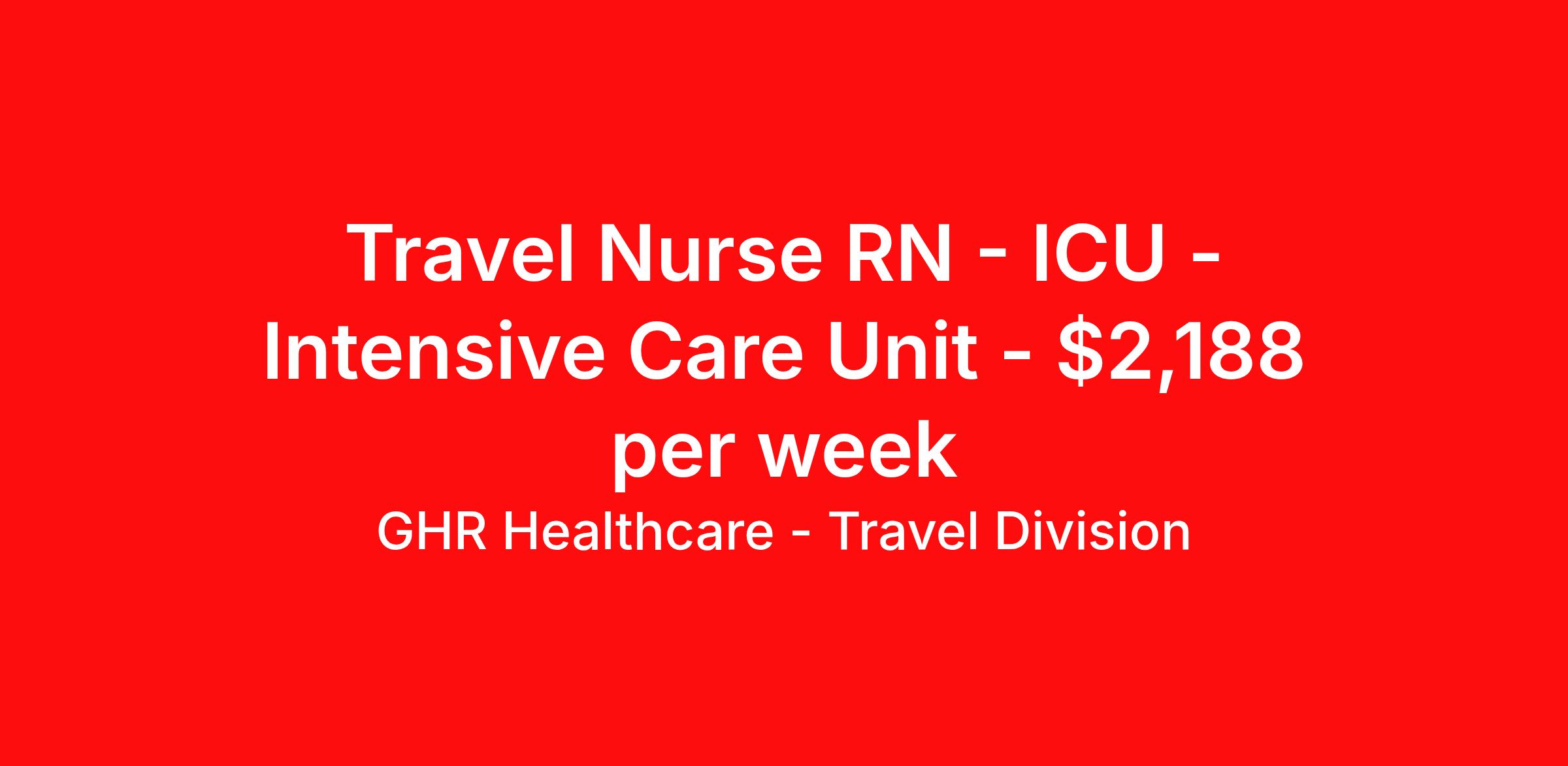 GHR Healthcare - Travel Division is seeking a travel nurse RN ICU - Intensive Care Unit for a travel nursing job in Philadelphia, Pennsylvania. Job Description & Requirements Specialty: ICU - Intensive Care Unit Discipline: RN Start Date: 04/20/2026 Duration: 13 weeks 36 hours per week Shift: 12 hours, days, nights Employment Type: Travel About GHR Healthcare - Travel Division For over 30 years, GHR Healthcare has been the bridge between healthcare professionals and the facilities that need them nationwide. We're committed to uncovering your ideal fit, supported by GHR's dedication to competitive compensation, transparent communication, and a devoted team that genuinely cares about your career journey. You can trust us to stand by your side as your advocate, confidante, and partner in advancing your career. At GHR, care and consideration are at the heart of everything we do. Visit ghrhealthcare.com to learn more.