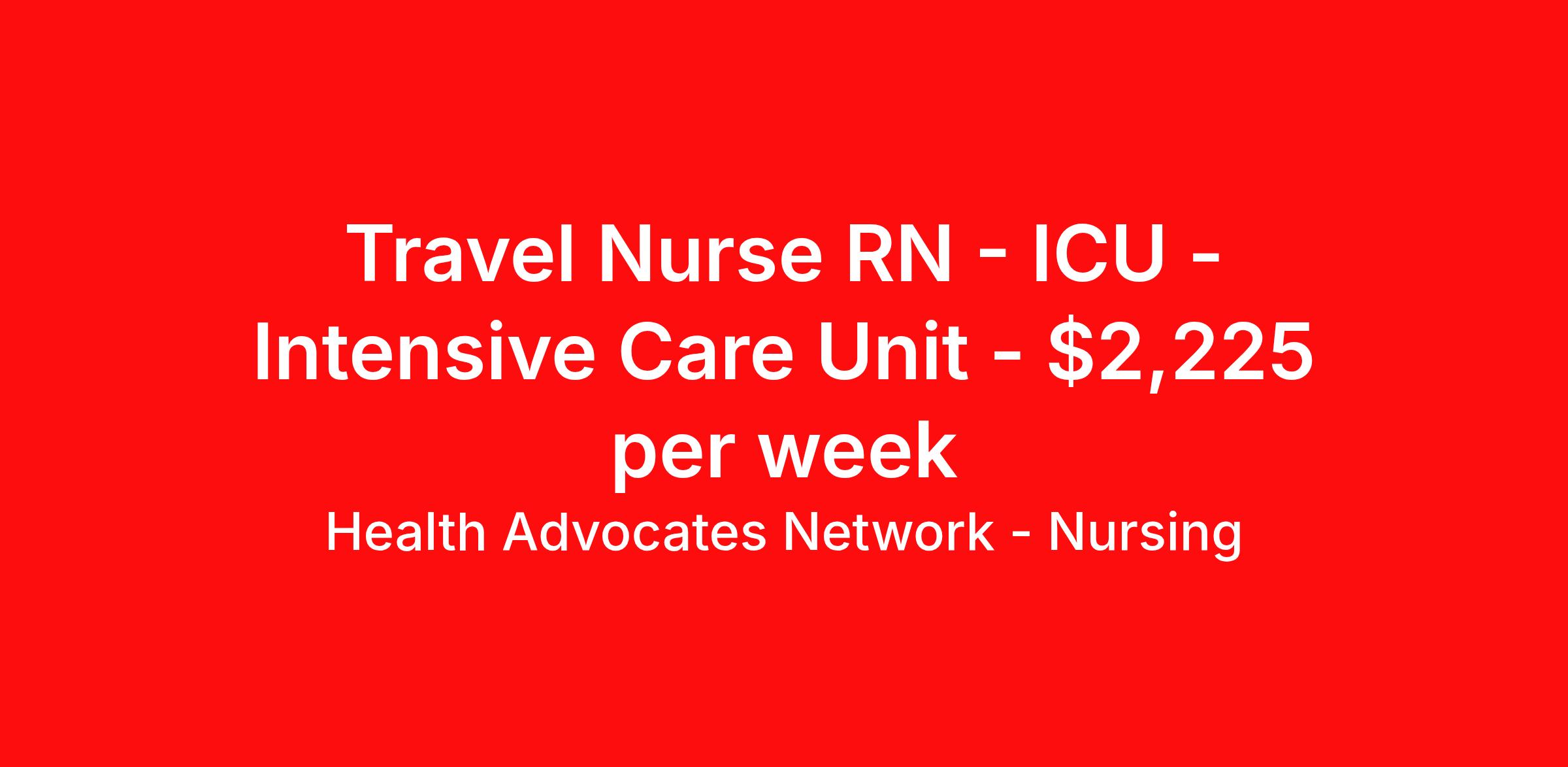 Health Advocates Network - Nursing is seeking a travel nurse RN ICU - Intensive Care Unit for a travel nursing job in Lexington, Kentucky. Job Description & Requirements Specialty: ICU - Intensive Care Unit Discipline: RN Start Date: 04/06/2026 Duration: 13 weeks 36 hours per week Shift: 12 hours, nights Employment Type: Travel HANStaff Job ID 521917. Pay package is based on 12 hour shifts and 36 hours per week (subject to confirmation) with tax-free stipend amount to be determined. Posted job title: RN - ICU About Health Advocates Network - Nursing Health Advocates Network was founded on the basis of a shared aspiration, to improve the way healthcare staffing is done. We are a company established and led by nurses. Our flexible approach enables us to develop solutions customized to your specific needs. From short- and long-term travel contracts to local and per diem assignments and more, we are here to get you to your next adventure! By solving challenges, providing the best placements, and advocating for you, we stand to help you thrive and pave the path forward in your career. Click on the videos below to learn more about our values!