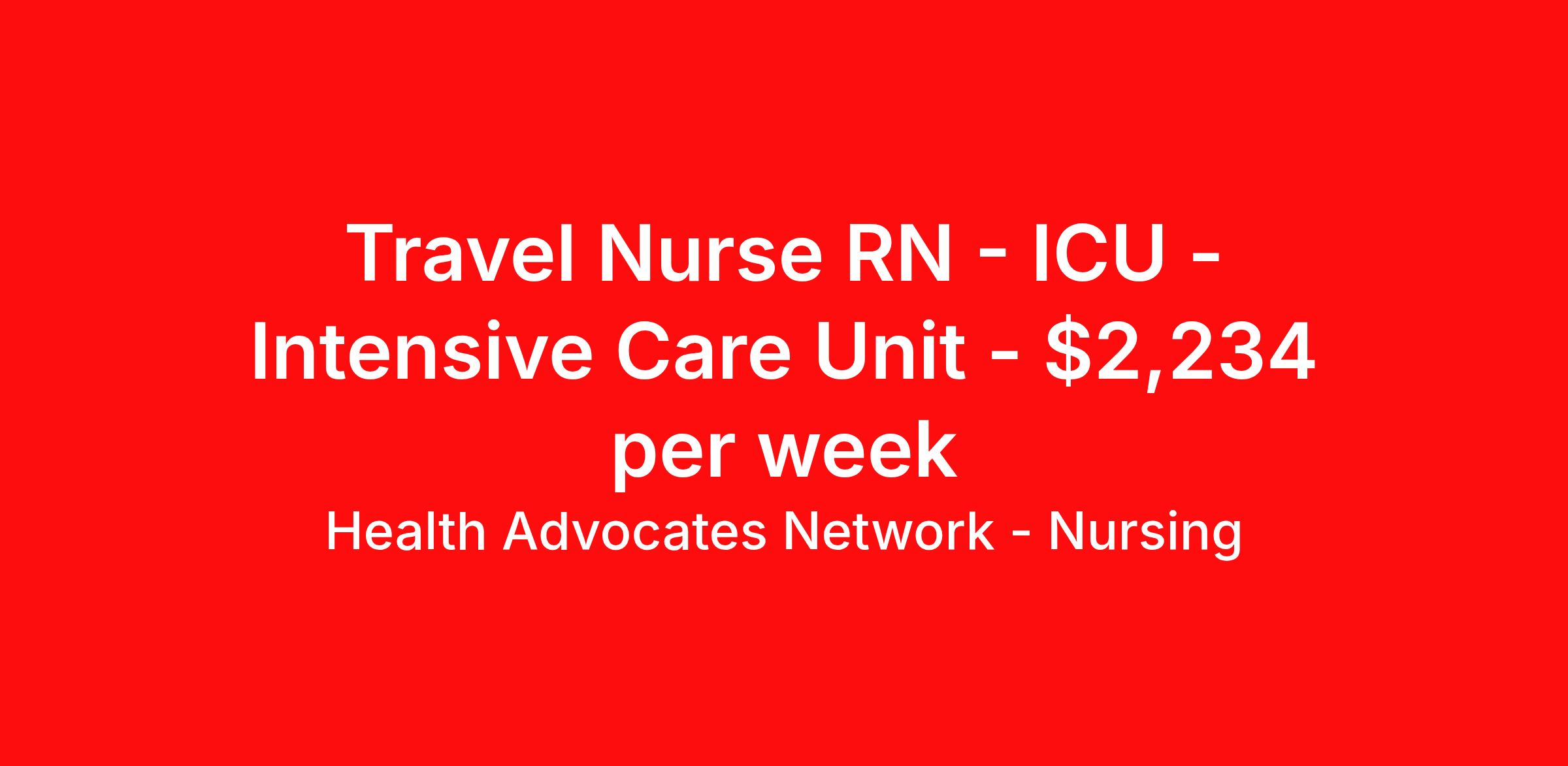 Health Advocates Network - Nursing is seeking a travel nurse RN ICU - Intensive Care Unit for a travel nursing job in Lexington, Kentucky. Job Description & Requirements Specialty: ICU - Intensive Care Unit Discipline: RN Start Date: 04/06/2026 Duration: 13 weeks 36 hours per week Shift: 12 hours, nights Employment Type: Travel Health Advocates Network is urgently hiring ICU Registered Nurses (RNs) in the Lexington, KY area. Must have 2 years of ICU experience. Pay Rate: $2,234 weekly Specialty: ICU Registered Nurse (RN) Shift: Night 13 Week Contracts and more available! Radius Rule: 50 mile radius applies Qualification and Requirements: Authorized to work in the United States. Graduate of an Accredited School of Nursing 2 years of experience as an ICU Registered Nurse (RN) American Heart Association BLS, ACLS, NIHSS Neuro Experience Required Travel experience required An active, current (KY) state license or reciprocation if applicable Apply for this job now or to find out more about other opportunities with Health Advocates Network, Inc. reply to this posting, contact us at or call/text . We can provide you unparalleled access to exciting career opportunities. Benefits We Offer: Competitive pay rates, Referral Bonus, Medical, Dental, Vision and 401k. Travel reimbursement and per diem allowances, Employee discounts, educational opportunities, and more! Who We Are: Health Advocates Network matches highly skilled applicants to positions at the best healthcare companies on a temporary and temporary-to-hire basis. Our mission is to provide you with a rewarding job that is well-matched to your skills – helping you advance in your career. Our experience, combined with our client relationships, makes Health Advocates Network a great resource for your career. Health Advocates Network, Inc. is an equal-opportunity employer. All qualified applicants shall receive consideration for employment without regard to any legally protected basis protected by applicable federal or state law except where a bona fide occupational qualification applies. Refer a Registered Nurse for a $1000.00 bonus opportunity! HANStaff Job ID 521921. Pay package is based on 12 hour shifts and 36 hours per week (subject to confirmation) with tax-free stipend amount to be determined. Posted job title: RN - ICU About Health Advocates Network - Nursing Health Advocates Network was founded on the basis of a shared aspiration, to improve the way healthcare staffing is done. We are a company established and led by nurses. Our flexible approach enables us to develop solutions customized to your specific needs. From short- and long-term travel contracts to local and per diem assignments and more, we are here to get you to your next adventure! By solving challenges, providing the best placements, and advocating for you, we stand to help you thrive and pave the path forward in your career. Click on the videos below to learn more about our values!