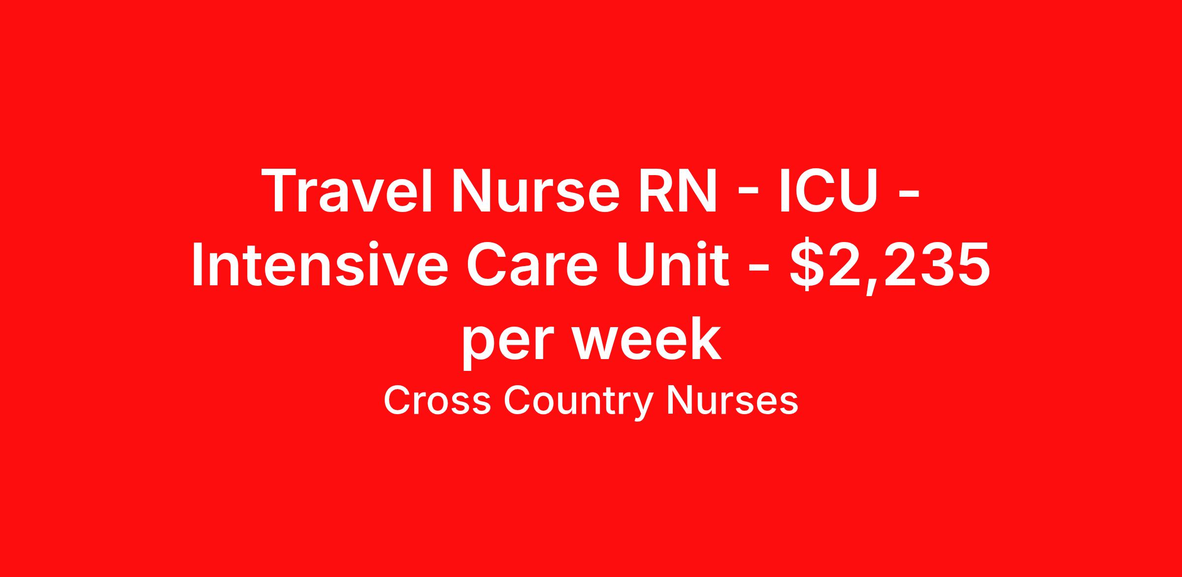 Cross Country Nurses is seeking a travel nurse RN ICU - Intensive Care Unit for a travel nursing job in Milwaukee, Wisconsin. Job Description & Requirements Specialty: ICU - Intensive Care Unit Discipline: RN Start Date: 04/06/2026 Duration: 13 weeks 36 hours per week Shift: 12 hours, days Employment Type: Travel Job Description As an intensive care unit nurse (RN ICU), you will be monitoring patients with highly unstable, life-threatening conditions, to ensure they receive the best possible care. You must be able to rapidly assess a patient's condition and intervene with the appropriate care, managing various life-support systems like ventilation and heart-monitoring. Additionally, you will extend emotional support and education to gravely ill patients and their families. Minimum Requirements At least 1 year of recent acute care experience in specialty Active RN license Benefits The benefits of taking a travel nursing job with Cross Country include: Private housing or generous housing allowance Comprehensive health insurance with prescription coverage Dependent health insurance with prescription coverage Competitive salaries Referral bonuses Travel reimbursement 401(k) retirement plan Direct deposit/free checking Unlimited free CE credits Cross Country Job ID 1236530. Pay package is based on 12 hour shifts and 36 hours per week (subject to confirmation) with tax-free stipend amount to be determined. Posted job title: Registered Nurse / Intensive Care Unit About Cross Country Nurses You care for others — we’re here to care for you. At Cross Country, we know travel nursing is about more than just the job. It’s about building a career that supports your lifestyle, your values, and your impact. We offer competitive pay, full benefits, and 24/7 support from a team that truly understands what it means to be on the front lines. Wherever your journey takes you, we’re with you every step of the way. Let’s build your best life — one assignment at a time. Benefits 401k retirement plan Referral bonus