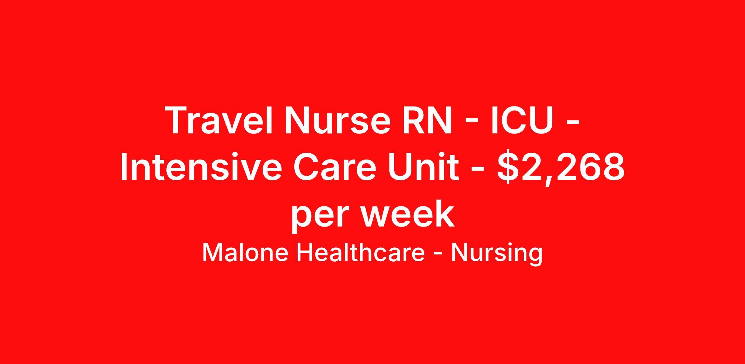 Malone Healthcare - Nursing is seeking a travel nurse RN ICU - Intensive Care Unit for a travel nursing job in Jamestown, North Dakota. Job Description & Requirements Specialty: ICU - Intensive Care Unit Discipline: RN Start Date: 04/13/2026 Duration: 13 weeks 36 hours per week Shift: 12 hours, nights Employment Type: Travel About Malone Healthcare - Nursing With a commitment to providing a higher standard of service and experience in patient care, Malone Healthcare places expert nurses and allied health professionals in rewarding careers throughout the United States. As a leading healthcare staffing agency, Malone’s focus on compliance and integrity translates to a seamless experience for our team members and partner facilities. When you work with Malone Healthcare, you can rely on over 50 years of proven experience placing exceptional professionals in quality healthcare settings. Benefits Weekly pay Holiday Pay Guaranteed Hours Continuing Education 401k retirement plan Pet insurance Referral bonus Medical benefits Dental benefits Vision benefits License and certification reimbursement Life insurance