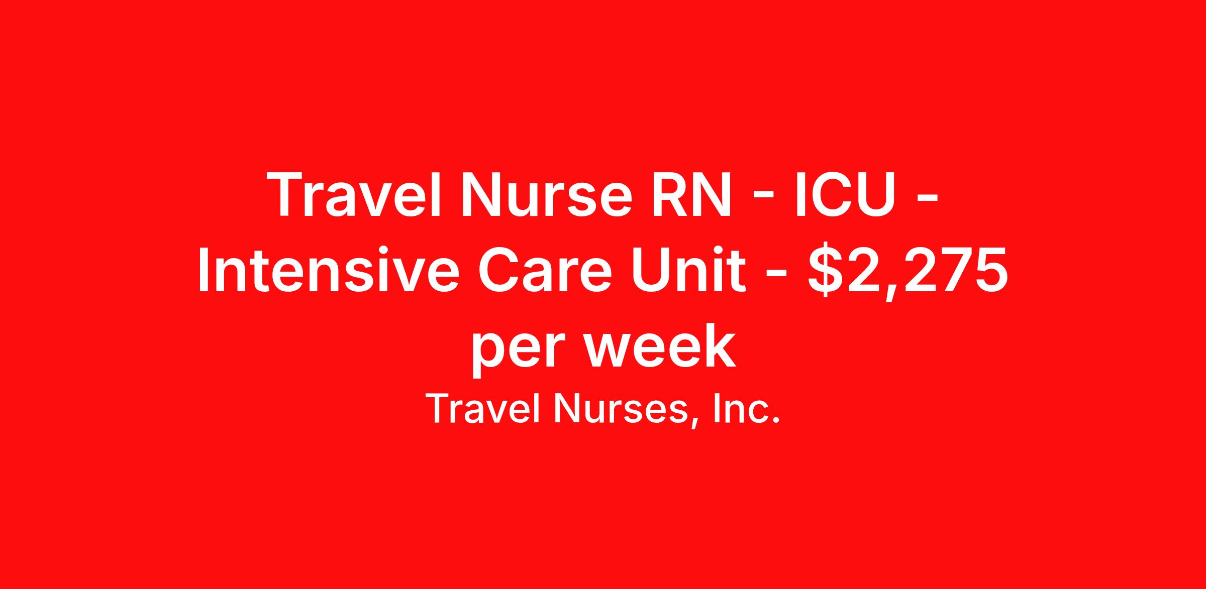 Travel Nurses, Inc. is seeking a travel nurse RN ICU - Intensive Care Unit for a travel nursing job in Exeter, New Hampshire. Job Description & Requirements Specialty: ICU - Intensive Care Unit Discipline: RN Start Date: 03/23/2026 Duration: 13 weeks 36 hours per week Shift: 12 hours Employment Type: Travel Travel Nurses, Inc. Job ID 306376. Pay package is based on 12 hour shifts and 36 hours per week (subject to confirmation) with tax-free stipend amount to be determined. Posted job title: Registered Nurse About Travel Nurses, Inc. Travel Nurses, Inc. is a leading healthcare staffing agency that provides healthcare professionals with opportunities to work across the country. Founded by nurses in 1988, TNI has more than 30 years of experience in the industry. The agency initially focused on staffing operating room settings in the MidSouth. However, this quickly evolved to encompass all nursing specialties and allied health fields nationwide. At the heart of our mission is a profound respect for nurses, whom we consider the cornerstone of healthcare. This acknowledgment extends beyond the nursing profession alone. Travel Nurses, Inc. now proudly embraces a wide array of healthcare professionals, recognizing their crucial roles in our collective mission. Travel Nurses, Inc. is dedicated to providing comprehensive support and opportunities that will help facilitate complete career mobility in the healthcare field. Our commitment to transparency ensures that all professionals, not just nurses, can confidently accept any assignment without financial uncertainties. We prioritize our professionals’ well-being with comprehensive benefits packages, including day-one healthcare coverage, competitive salaries, bonuses and incentives. This underscores our unwavering commitment to offering the best possible rewards and support for all the professionals we serve. Benefits Weekly pay Continuing Education 401k retirement plan Wellness and fitness programs Mileage reimbursement Referral bonus Employee assistance programs Medical benefits Dental benefits Vision benefits Benefits start day 1 License and certification reimbursement Life insurance Retention bonus