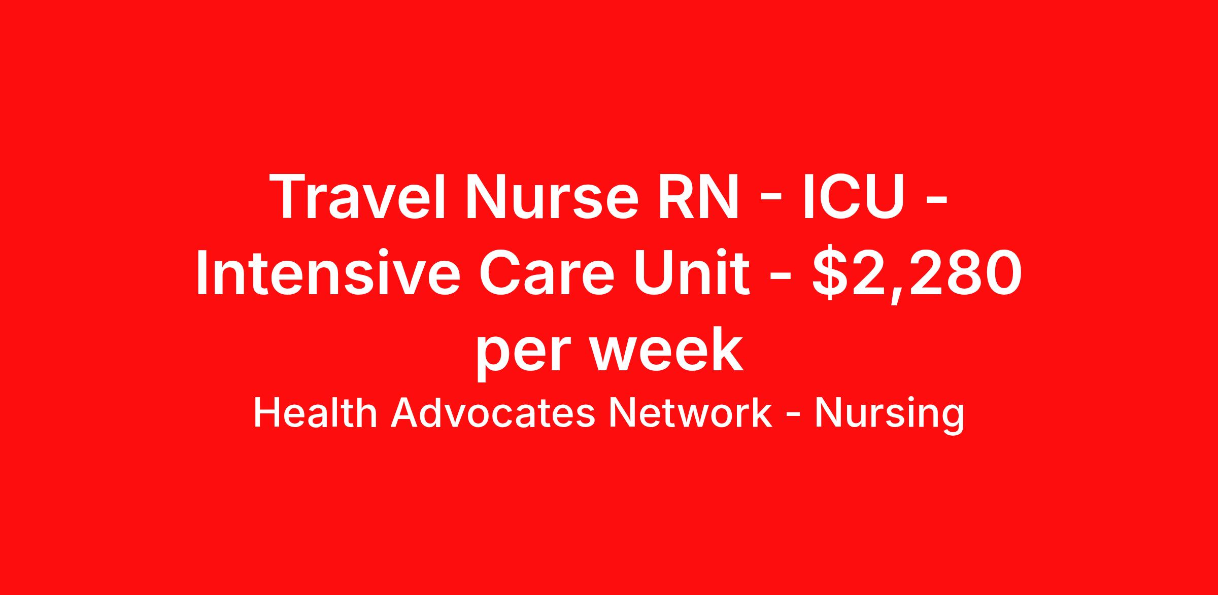 Health Advocates Network - Nursing is seeking a travel nurse RN ICU - Intensive Care Unit for a travel nursing job in Glendale, Arizona. Job Description & Requirements Specialty: ICU - Intensive Care Unit Discipline: RN Start Date: 04/06/2026 Duration: 12 weeks 36 hours per week Shift: 12 hours, days Employment Type: Travel HANStaff Job ID 522211. Pay package is based on 12 hour shifts and 36 hours per week (subject to confirmation) with tax-free stipend amount to be determined. Posted job title: RN - ICU About Health Advocates Network - Nursing Health Advocates Network was founded on the basis of a shared aspiration, to improve the way healthcare staffing is done. We are a company established and led by nurses. Our flexible approach enables us to develop solutions customized to your specific needs. From short- and long-term travel contracts to local and per diem assignments and more, we are here to get you to your next adventure! By solving challenges, providing the best placements, and advocating for you, we stand to help you thrive and pave the path forward in your career. Click on the videos below to learn more about our values!