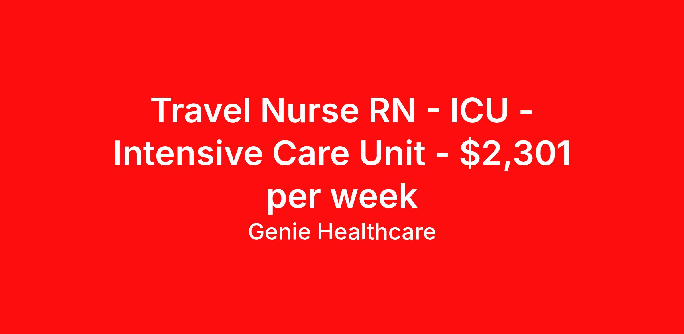 Genie Healthcare is seeking a travel nurse RN ICU - Intensive Care Unit for a travel nursing job in Madison, Wisconsin. Job Description & Requirements Specialty: ICU - Intensive Care Unit Discipline: RN Start Date: 04/06/2026 Duration: 13 weeks 36 hours per week Shift: 12 hours, nights Employment Type: Travel Genie Healthcare is looking for a RN to work in Intensive Care Unit (ICU) for a 13 weeks travel assignment located in Madison, WI for the Shift (3x12 nights, 19:00:00-07:00:00, 12.00-3). Pay and benefits packages are estimated based on client bill rate at time the job was posted. These rates are subject to change. Exact pay and benefits vary based on several things, including, but not limited to, guaranteed hours, client changes in bill rate, experience, etc. Benefits: Medical Insurance, Dental Insurance, Vision Insurance, 401(k) with company matching (50% up to 6% of what you contribute) Genie Healthcare Job ID 17968373. Pay package is based on 12 hour shifts and 36.0 hours per week (subject to confirmation) with tax-free stipend amount to be determined. Posted job title: RN:Intensive Care Unit (ICU),19:00:00-07:00:00 About Genie Healthcare Genie Healthcare is one of the fastest growing Nurse Travel Agencies in the USA. Genie serves hundreds of facilities and has over 4000 current travel RN contracts open at any given time. Genie provides travel RN’s flexibility, support, top pay scale, housing and the 1 rated, multi-state health insurance coverage. Genie Healthcare carries with it a commitment to providing a comprehensive level of service and quality care. Growing from a small team of eager recruiters to a company with satisfied clients in nearly every corner of the nation, delivering excellence in patient and customer care is the key to Genie’s success. The management team has 20 years of experience in workforce solutions and staffing in medical and non-medical fields, roles ranging from Clerical job to Cardiologist to software developer to CEO.