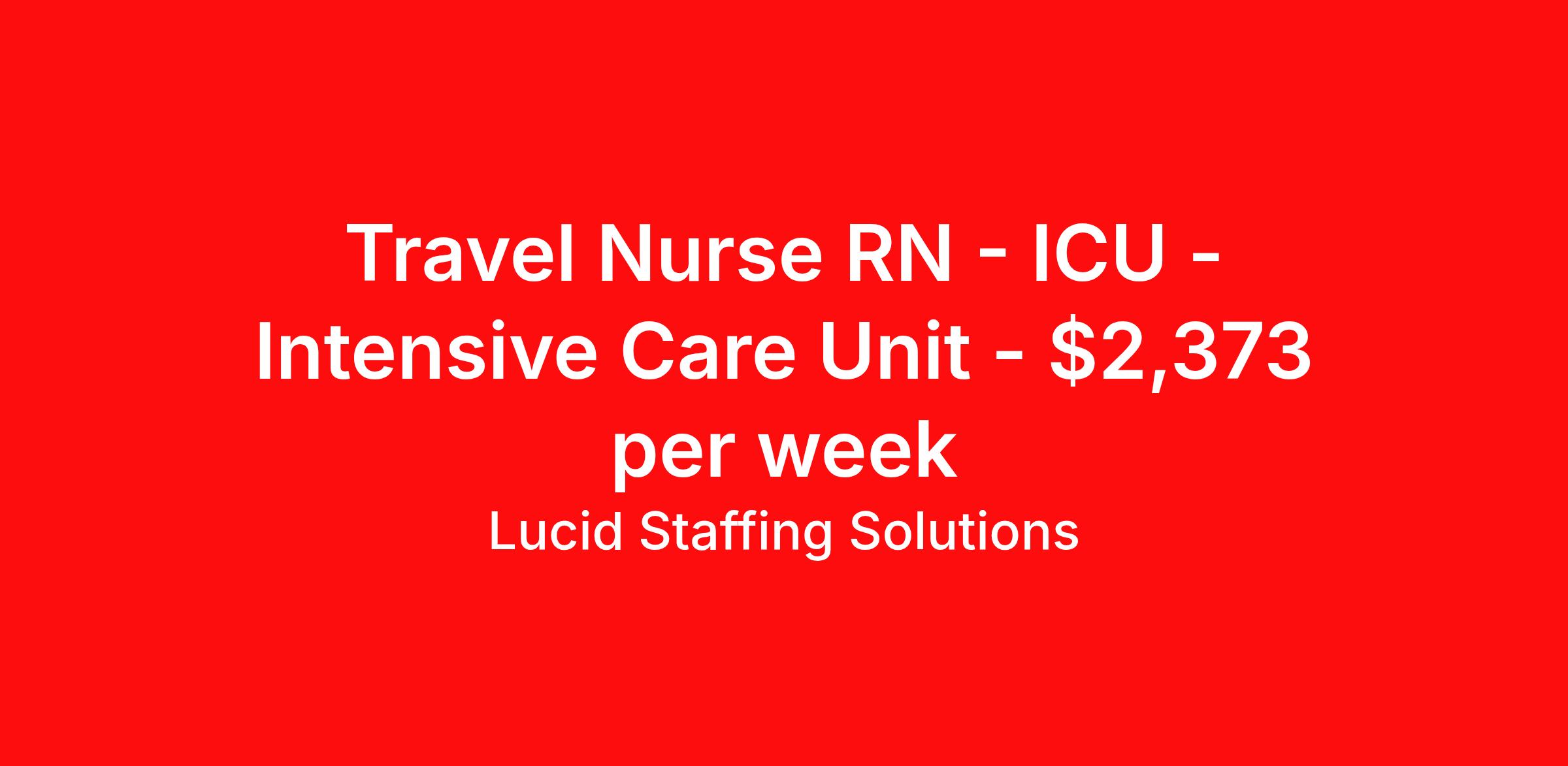 Lucid Staffing Solutions is seeking a travel nurse RN ICU - Intensive Care Unit for a travel nursing job in Lebanon, New Hampshire. Job Description & Requirements Specialty: ICU - Intensive Care Unit Discipline: RN Duration: 13 weeks 36 hours per week Shift: 12 hours, nights Employment Type: Travel Job Description Position: Travel Registered Nurse (RN) with experience in ICU Location: Lebanon, New Hampshire Shift: hr Night Weekly Gross: $2373.12 Lucid Staffing Solutions was created by former healthcare workers who lived the short staffing, the chaotic workflows, and the nonstop pressure that comes with patient care. We built an agency powered by real clinical experience, kept simple and supportive, so you never have to guess whether the people guiding you actually know what they’re talking about. Minimum Requirements: Active license as a Registered Nurse (RN) Licensed in New Hampshire (If applicable) or compact eligible Two years of recent ICU experience Active BLS Why Lucid Works for Travelers Paid Weekly: Stipends pushed to GSA limits whenever possible $500 Travel Reimbursement: Paid at the start of each assignment Clinician-Led Team: Recruiters and Account Managers with real clinical experience In-House Compliance: fast updates, real communication, and none of the delays that come with outsourced vendors. Health Coverage Options: Multiple medical plans plus dental, vision, and workers compensation 401(k) Match: 4 percent match after 6 months License & Certification Reimbursement: We help cover the cost of staying compliant Liability Insurance: Included automatically Referral Bonuses: $500 per referral, $750 after five referrals Ready to start your journey? Apply today to connect with a Clinician-Recruiter! Lucid Staffing Solutions Job ID 36849. Pay package is based on 12 hour shifts and 36 hours per week (subject to confirmation) with tax-free stipend amount to be determined. Posted job title: ICU About Lucid Staffing Solutions Clinician Owned & Operated At Lucid Staffing Solutions, we do things differently—because we’ve been in your shoes. Founded by actual healthcare professionals, Lucid was built to fix the issues we experienced as travelers. We know what makes a great assignment: competitive pay, seamless onboarding, honest recruiters, and most importantly—working with a team that truly sees and supports you. Our entire team is made up of former clinicians who understand the demands of the job and what travelers truly need to succeed. We offer some of the highest paying allied health and nursing contracts across the country, along with some amazing benefits & perks. Whether you're chasing freedom, flexible schedules, bigger paychecks, or your next adventure, Lucid helps you get there—with real support, real respect , and real healthcare experts. Benefits Dental benefits Medical benefits Vision benefits