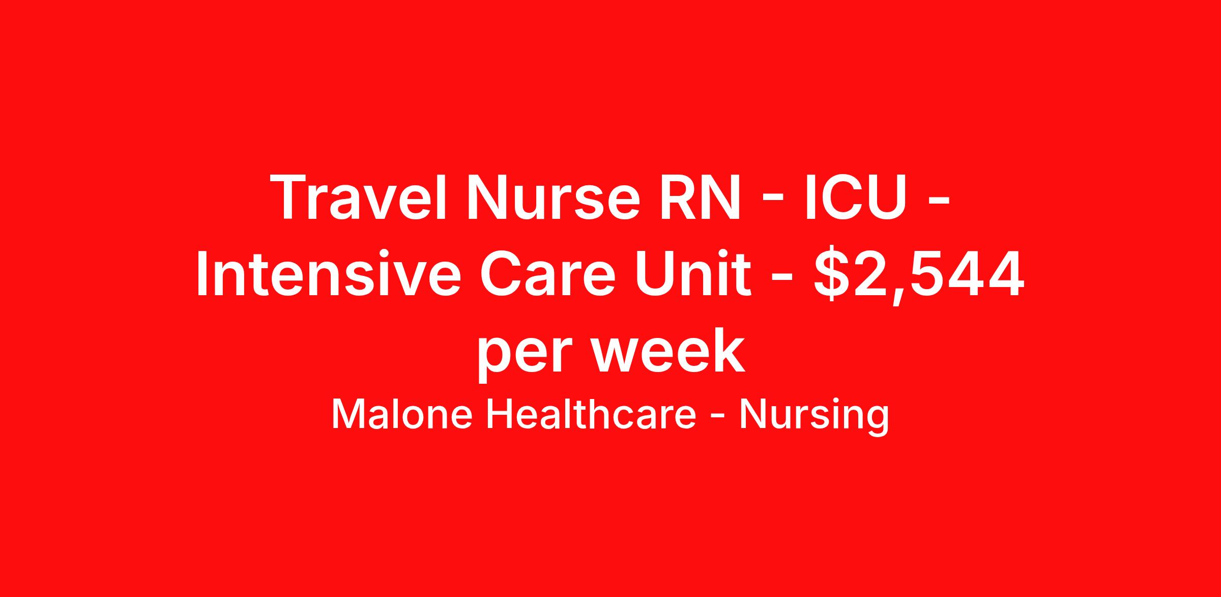 Malone Healthcare - Nursing is seeking a travel nurse RN ICU - Intensive Care Unit for a travel nursing job in Novato, California. Job Description & Requirements Specialty: ICU - Intensive Care Unit Discipline: RN Start Date: 04/06/2026 Duration: 13 weeks 36 hours per week Shift: 12 hours, nights Employment Type: Travel About Malone Healthcare - Nursing With a commitment to providing a higher standard of service and experience in patient care, Malone Healthcare places expert nurses and allied health professionals in rewarding careers throughout the United States. As a leading healthcare staffing agency, Malone’s focus on compliance and integrity translates to a seamless experience for our team members and partner facilities. When you work with Malone Healthcare, you can rely on over 50 years of proven experience placing exceptional professionals in quality healthcare settings. Benefits Weekly pay Holiday Pay Guaranteed Hours Continuing Education 401k retirement plan Pet insurance Referral bonus Medical benefits Dental benefits Vision benefits License and certification reimbursement Life insurance