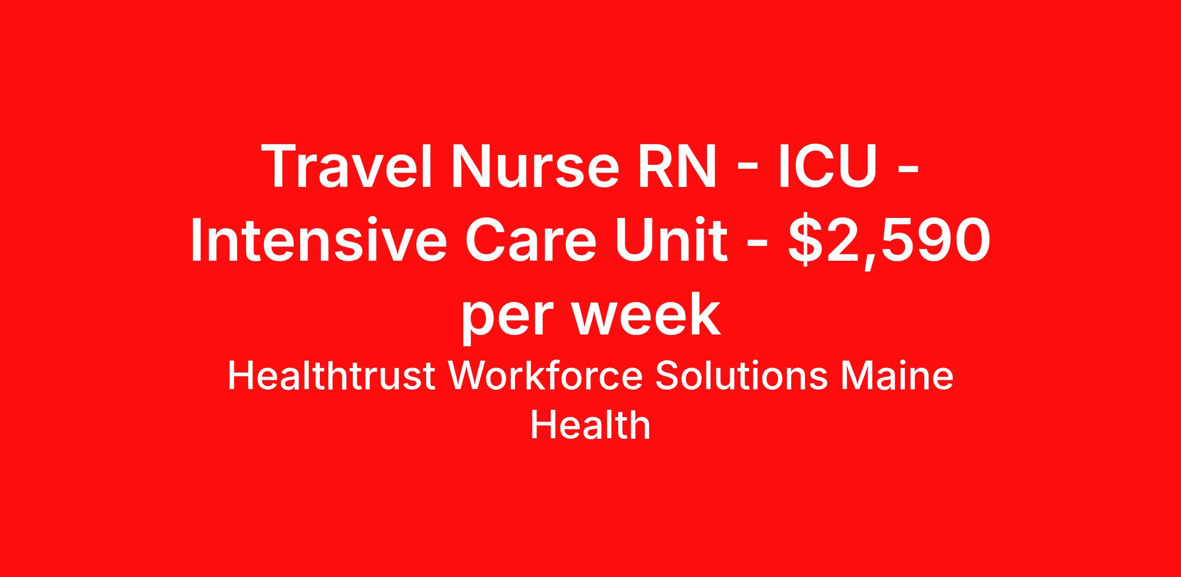 Healthtrust Workforce Solutions Maine Health is seeking a travel nurse RN ICU - Intensive Care Unit for a travel nursing job in Rockport, Maine. Job Description & Requirements Specialty: ICU - Intensive Care Unit Discipline: RN Start Date: 04/20/2026 Duration: 13 weeks 36 hours per week Shift: 12 hours, days Employment Type: Travel ICU Nurse FACILITY: PBMC◾ Rockport, ME Gross Weekly: $2,589.69 Hourly Rate: $32 Weekly Stipends: $1,152.00 ⌚ Days 12hr shifts 7a–7p (0700-1930) - every other weekend Charting: Epic WHAT YOU NEED ✔ 2 years recent specialty experience ✔ Unit/Skill: ICU/Step Down Float Requirements: Yes- MSU or others as resource (peds not required) ✔ Certs: • BLS (AHA) • ACLS (AHA) • NIHSS, PALS-preferred but no required READY TO APPLY? Drop a comment or message Vivian to secure your spot before it’s gone