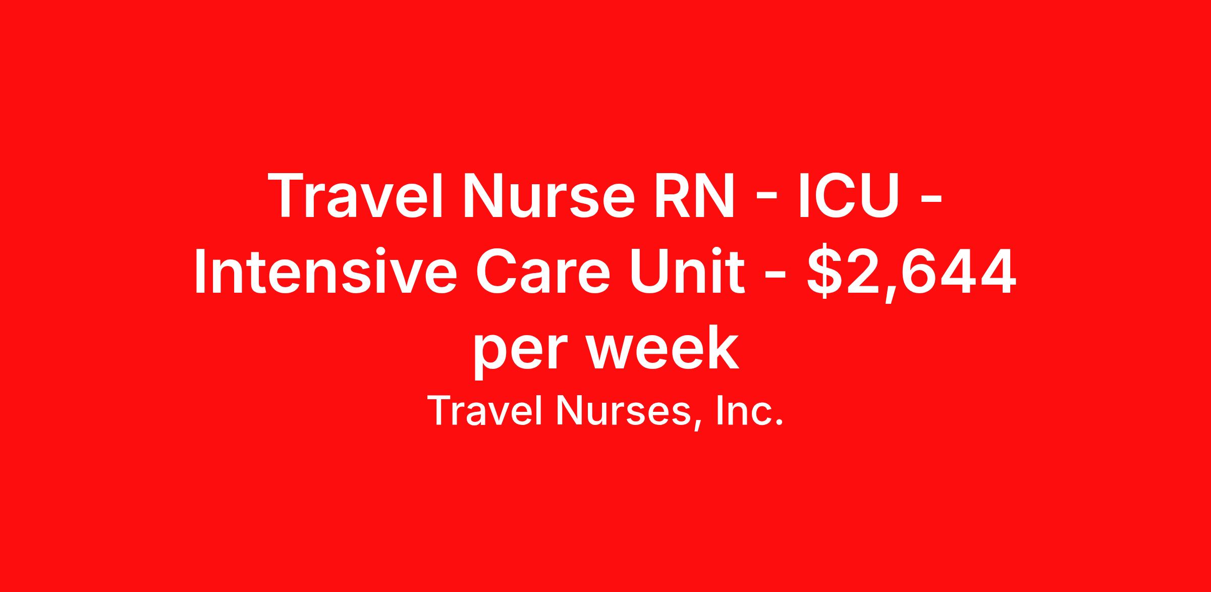 Travel Nurses, Inc. is seeking a travel nurse RN ICU - Intensive Care Unit for a travel nursing job in Boston, Massachusetts. Job Description & Requirements Specialty: ICU - Intensive Care Unit Discipline: RN Start Date: ASAP Duration: 13 weeks 36 hours per week Shift: 12 hours Employment Type: Travel Travel Nurses, Inc. Job ID 282368. Pay package is based on 12 hour shifts and 36 hours per week (subject to confirmation) with tax-free stipend amount to be determined. Posted job title: Registered Nurse About Travel Nurses, Inc. Travel Nurses, Inc. is a leading healthcare staffing agency that provides healthcare professionals with opportunities to work across the country. Founded by nurses in 1988, TNI has more than 30 years of experience in the industry. The agency initially focused on staffing operating room settings in the MidSouth. However, this quickly evolved to encompass all nursing specialties and allied health fields nationwide. At the heart of our mission is a profound respect for nurses, whom we consider the cornerstone of healthcare. This acknowledgment extends beyond the nursing profession alone. Travel Nurses, Inc. now proudly embraces a wide array of healthcare professionals, recognizing their crucial roles in our collective mission. Travel Nurses, Inc. is dedicated to providing comprehensive support and opportunities that will help facilitate complete career mobility in the healthcare field. Our commitment to transparency ensures that all professionals, not just nurses, can confidently accept any assignment without financial uncertainties. We prioritize our professionals’ well-being with comprehensive benefits packages, including day-one healthcare coverage, competitive salaries, bonuses and incentives. This underscores our unwavering commitment to offering the best possible rewards and support for all the professionals we serve. Benefits Weekly pay Continuing Education 401k retirement plan Wellness and fitness programs Mileage reimbursement Referral bonus Employee assistance programs Medical benefits Dental benefits Vision benefits Benefits start day 1 License and certification reimbursement Life insurance Retention bonus