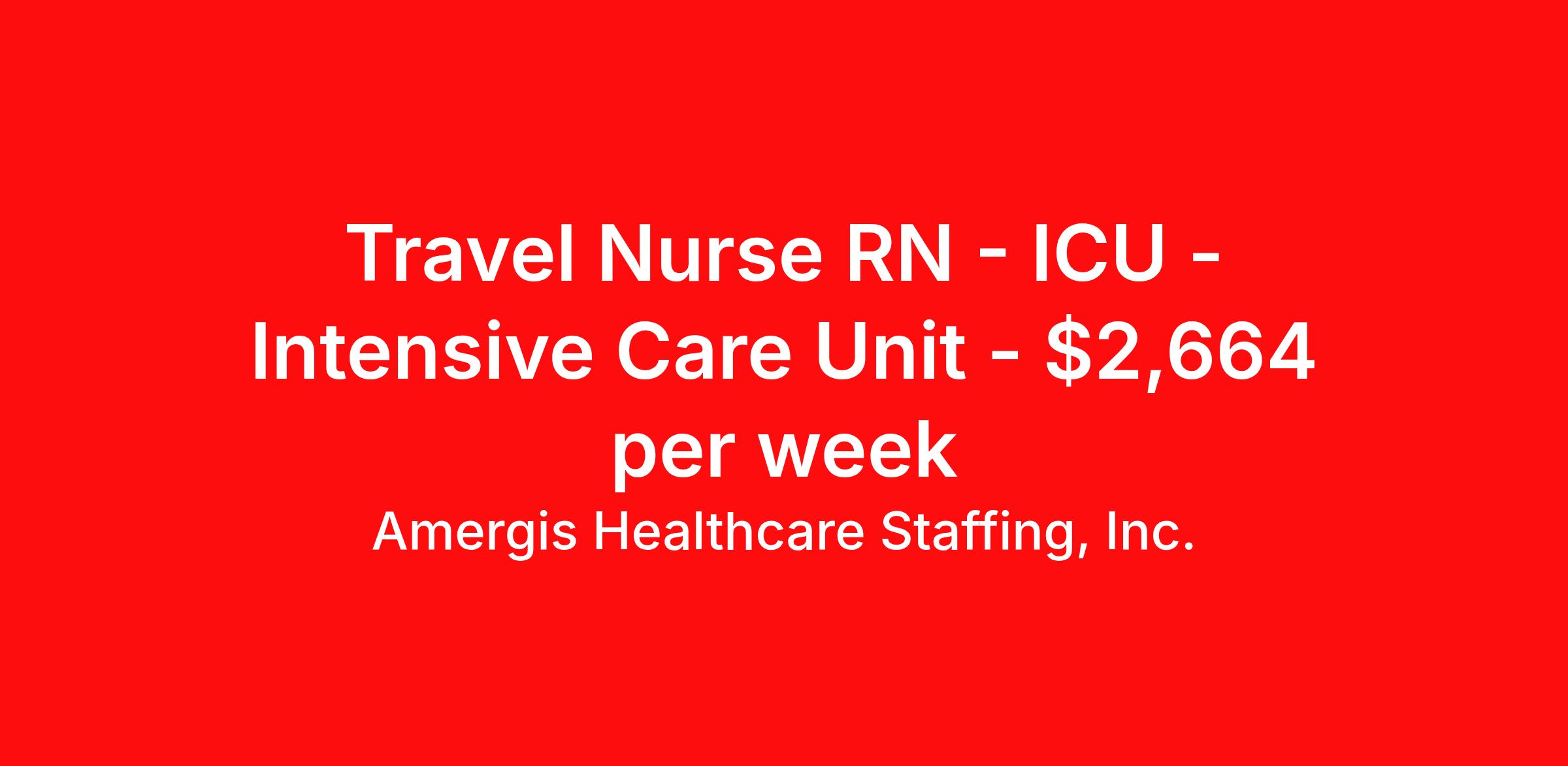 Amergis Healthcare Staffing, Inc. is seeking a travel nurse RN ICU - Intensive Care Unit for a travel nursing job in Washington, District of Columbia. Job Description & Requirements Specialty: ICU - Intensive Care Unit Discipline: RN Duration: 13 weeks 36 hours per week Shift: 12 hours Employment Type: Travel The Critical Care Registered Nurse assumes responsibility and accountability for the application of the nursing process and the delivery of patient care in a variety of critical care settings. Consistently performs according to nursing standards and is accountable in managing patient care and assisting others in the management of patient care. Responsibilities include monitoring, assessment, vital sign monitoring, ventilator management, medication administration, intravenous insertion and infusion, central line care, catheters, and maintenance of a running record of the patient’s status. The Critical Care RN must be prepared at all times to perform cardiopulmonary resuscitation and other lifesaving measures for the patients in their care. Minimum Requirements: Current Registered Nurse License for the state in which the nurse practices One year of critical care experience is preferred Minimum of one year acute or critical care experience preferred Current BLS card; current ACLS/PALS card (per facility requirement) TB Questionnaire, PPD or chest x-ray if applicable Current Health certificate (per contract or state regulation) Must meet all federal, state and local requirements Must be at least 18 years of age Benefits At Amergis, we firmly believe that our employees are the heartbeat of our organization and we are happy to offer the following benefits: Competitive pay & weekly paychecks Health, dental, vision, and life insurance 401(k) savings plan Awards and recognition programs *Benefit eligibility is dependent on employment status. About Amergis Amergis, formerly known as Maxim Healthcare Staffing, has served our clients and communities by connecting people to the work that matters since 1988. We provide meaningful opportunities to our extensive network of healthcare and school-based professionals, ready to work in any hospital, government facility, or school. Through partnership and innovation, Amergis creates unmatched staffing experiences to deliver the best workforce solutions. Amergis is an equal opportunity/affirmative action employer. All qualified applicants will receive consideration for employment without regard to sex, gender identity, sexual orientation, race, color, religion, national origin, disability, protected Veteran status, age, or any other characteristic protected by law. Amergis Job ID 1107334. Pay package is based on 12 hour shifts and 36 hours per week (subject to confirmation) with tax-free stipend amount to be determined. Posted job title: Critical Care RN Openings - Washington D.C. About Amergis Healthcare Staffing, Inc. Amergis, formerly known as Maxim Healthcare Staffing, has served our clients and communities by connecting people to the work that matters since 1988. We provide meaningful opportunities to our extensive network of healthcare and school-based professionals, ready to work in any hospital, government facility, or school. Through partnership and innovation, Amergis creates unmatched staffing experiences to deliver the best workforce solutions.