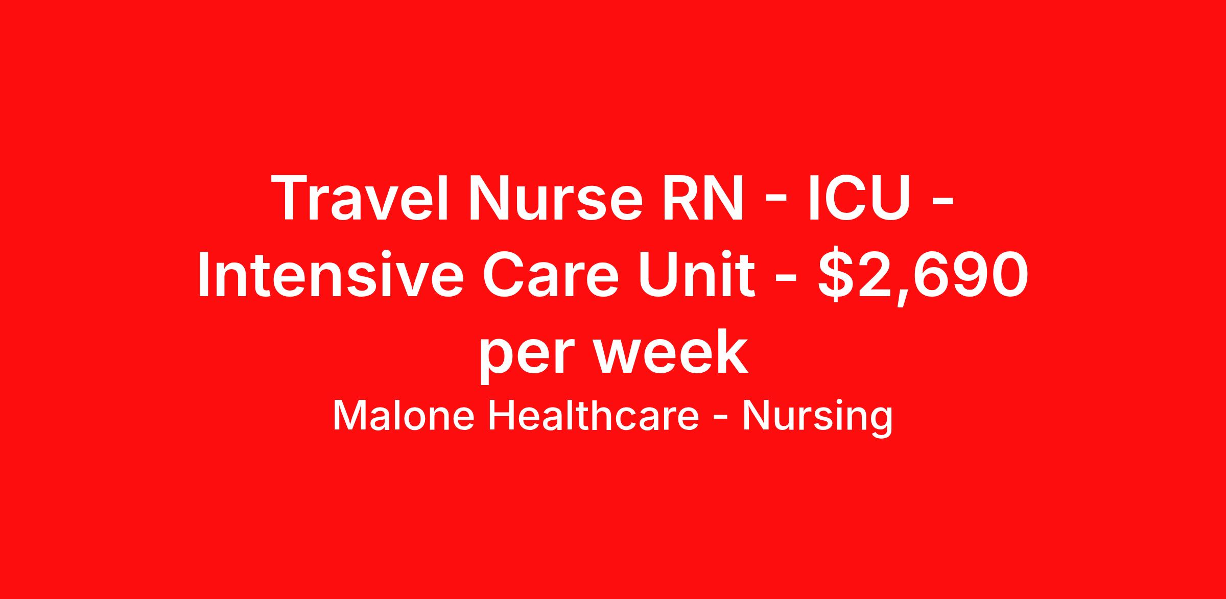 Malone Healthcare - Nursing is seeking a travel nurse RN ICU - Intensive Care Unit for a travel nursing job in Burlington, Massachusetts. Job Description & Requirements Specialty: ICU - Intensive Care Unit Discipline: RN Start Date: 03/23/2026 Duration: 13 weeks 36 hours per week Shift: 12 hours, days, nights, rotating Employment Type: Travel Start date : March 23, 2026 Requirements: 2–5 years ICU experience Trauma Level I experience preferred (Level II may be considered) Previous travel experience preferred Experience with Epic charting required BLS and ACLS from American Heart Association Active Massachusetts RN License About Malone Healthcare - Nursing With a commitment to providing a higher standard of service and experience in patient care, Malone Healthcare places expert nurses and allied health professionals in rewarding careers throughout the United States. As a leading healthcare staffing agency, Malone’s focus on compliance and integrity translates to a seamless experience for our team members and partner facilities. When you work with Malone Healthcare, you can rely on over 50 years of proven experience placing exceptional professionals in quality healthcare settings. Benefits Weekly pay Holiday Pay Guaranteed Hours Continuing Education 401k retirement plan Pet insurance Referral bonus Medical benefits Dental benefits Vision benefits License and certification reimbursement Life insurance