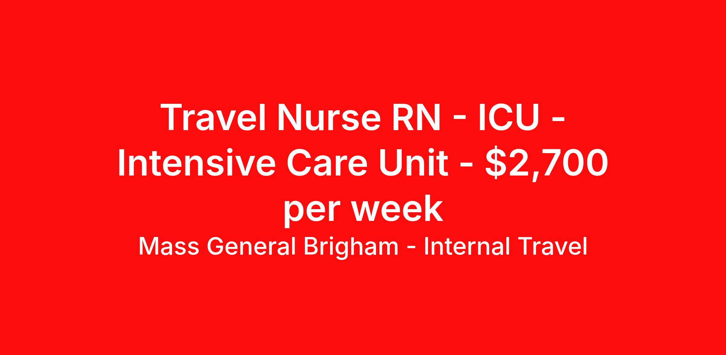 Mass General Brigham - Internal Travel is seeking a travel nurse RN ICU - Intensive Care Unit for a travel nursing job in Oak Bluffs, Massachusetts. Job Description & Requirements Specialty: ICU - Intensive Care Unit Discipline: RN Duration: 13 weeks 36 hours per week Shift: 12 hours, days Employment Type: Travel Primary Location: MARTHA'S VINEYARD HOSPITAL, OAK BLUFFS, MA Job Title: Registered Nurse Organization: Mass General Brigham Schedule: Full-time Shift: ROTATING Employee Status: Temporary ALL MGB Internal Resource Pool Positions include off-shift differentials Mass General Brigham is looking for Registered Nurses to join our Internal Resource Pool (IRP). The IRP will allow RNs flexibility in scheduling short- or long-term assignments within our Mass General Brigham Hospitals at a premium rate of pay. All positions will be placed in inpatient or long term care units. Current licensure as a Registered Nurse in the Commonwealth of Massachusetts. Certification: AHA BLS, ACLS Education: Minimum 2 years of RN experience in specialty. Graduation from an accredited nursing program. BSN Preferred. Mass General Brigham - Internal Travel Job ID JO25-70047. About Mass General Brigham - Internal Travel As a not-for-profit organization, Mass General Brigham is committed to supporting patient care, research, teaching, and service to the community by leading innovation across our system. Founded by Brigham and Women’s Hospital and Massachusetts General Hospital, Mass General Brigham supports a complete continuum of care including community and specialty hospitals, a managed care organization, a physician network, community health centers, home care and other health-related entities. Several of our hospitals are teaching affiliates of Harvard Medical School, and our system is a national leader in biomedical research. We’re passionate about a people-first culture for our system’s patients and our professional family. That’s why we provide our employees with more ways to achieve their potential. Mass General Brigham is committed to aligning our employees’ personal aspirations with projects that match their capabilities and crafting a culture that empowers our managers to become trusted mentors. We support each member of our team to own their personal development—and we recognize success at every step. Our employees use the Mass General Brigham values to govern decisions, actions and behaviors. These values guide how we get our work done: Patients, Affordability, Accountability & Service Commitment, Decisiveness, Innovation & Thoughtful Risk; and how we treat each other: Diversity & Inclusion, Integrity & Respect, Learning, Continuous Improvement & Personal Growth, Partnership & Collaboration. Mass General Brigham is looking for Registered Nurses to join our Internal Resource Pool (IRP). The IRP will allow RNs flexibility in scheduling short—or long-term assignments within our Mass General Brigham Hospitals at a premium rate of pay. All positions will be placed in inpatient or long-term care units. Benefits Weekly pay Holiday Pay 403b retirement plan Company provided housing options Sick pay Mileage reimbursement Discount program