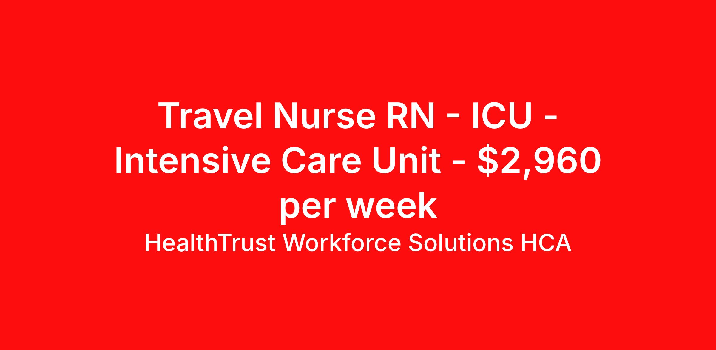 HealthTrust Workforce Solutions HCA is seeking a travel nurse RN ICU - Intensive Care Unit for a travel nursing job in Alexandria, Louisiana. Job Description & Requirements Specialty: ICU - Intensive Care Unit Discipline: RN Duration: 13 weeks 48 hours per week Shift: 12 hours, nights Employment Type: Travel Now Hiring! Experienced MICU Nurse for Travel Nursing Opportunity in Alexandria, LA! Looking for the next career move? We have a great opportunity for a travel contract! Benefits of working with HealthTrust Competitive Pay Rates Priority Offers Responsive Recruiter Weekly Direct Deposits Guaranteed Hours Dental benefits Vision benefits Earn up to $750 for referrals Continuing Education Please Call, Text or Email Dean Myers for more information – About HealthTrust Workforce Solutions HCA At HealthTrust Workforce Solutions, healthcare is not just about the four walls of a facility but about the people who provide and receive care. Our focus is on empowering healthcare professionals to deliver exceptional patient experiences by providing them with the necessary skills, tools, and support. We partner with healthcare facilities nationwide to ensure that the right professionals are in the right roles. We prioritize our clinicians by giving them a voice and access to opportunities to fulfill their mission of improving lives by providing quality patient care. We are committed to our core values of Trust, Innovation, Adaptability, Courage, and Accountability. We are dedicated to positively impacting the healthcare industry by providing first-priority access to more than 200,000 jobs nationwide to our healthcare professionals. Join us and be part of the HealthTrust family, where you can make a difference every day. We embrace our changing environment, and we maintain a culture that has a rich tradition of transforming itself to meet the challenges of the future. MISSION STATEMENT While putting great people in the right roles is essential, our mission is far greater. We want our clinicians to be part of the HealthTrust family, where healthcare professionals have a voice and are empowered with the right tools and opportunities to fulfill their personal mission of improving lives. Plus, as a preferred partner to thousands of top-performing hospitals, we provide our healthcare professionals with first-priority access to more than 200,000 jobs nationwide. Benefits Dental benefits Vision benefits Referral bonus Continuing Education Life insurance