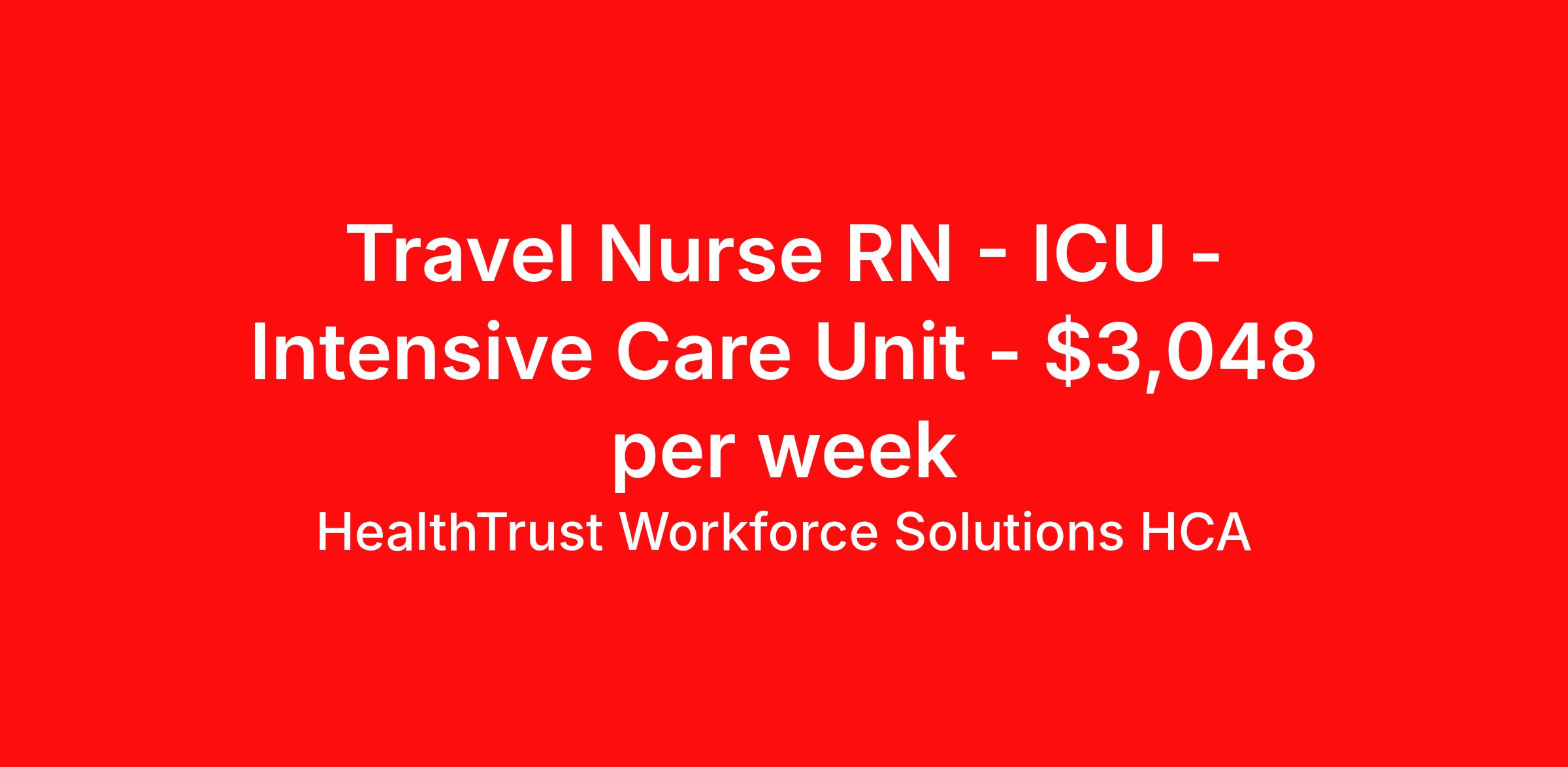 HealthTrust Workforce Solutions HCA is seeking a travel nurse RN ICU - Intensive Care Unit for a travel nursing job in Charleston, South Carolina. Job Description & Requirements Specialty: ICU - Intensive Care Unit Discipline: RN Duration: 13 weeks 48 hours per week Shift: 12 hours, days Employment Type: Travel About HealthTrust Workforce Solutions HCA At HealthTrust Workforce Solutions, healthcare is not just about the four walls of a facility but about the people who provide and receive care. Our focus is on empowering healthcare professionals to deliver exceptional patient experiences by providing them with the necessary skills, tools, and support. We partner with healthcare facilities nationwide to ensure that the right professionals are in the right roles. We prioritize our clinicians by giving them a voice and access to opportunities to fulfill their mission of improving lives by providing quality patient care. We are committed to our core values of Trust, Innovation, Adaptability, Courage, and Accountability. We are dedicated to positively impacting the healthcare industry by providing first-priority access to more than 200,000 jobs nationwide to our healthcare professionals. Join us and be part of the HealthTrust family, where you can make a difference every day. We embrace our changing environment, and we maintain a culture that has a rich tradition of transforming itself to meet the challenges of the future. MISSION STATEMENT While putting great people in the right roles is essential, our mission is far greater. We want our clinicians to be part of the HealthTrust family, where healthcare professionals have a voice and are empowered with the right tools and opportunities to fulfill their personal mission of improving lives. Plus, as a preferred partner to thousands of top-performing hospitals, we provide our healthcare professionals with first-priority access to more than 200,000 jobs nationwide. Benefits Dental benefits Vision benefits Referral bonus Continuing Education Life insurance