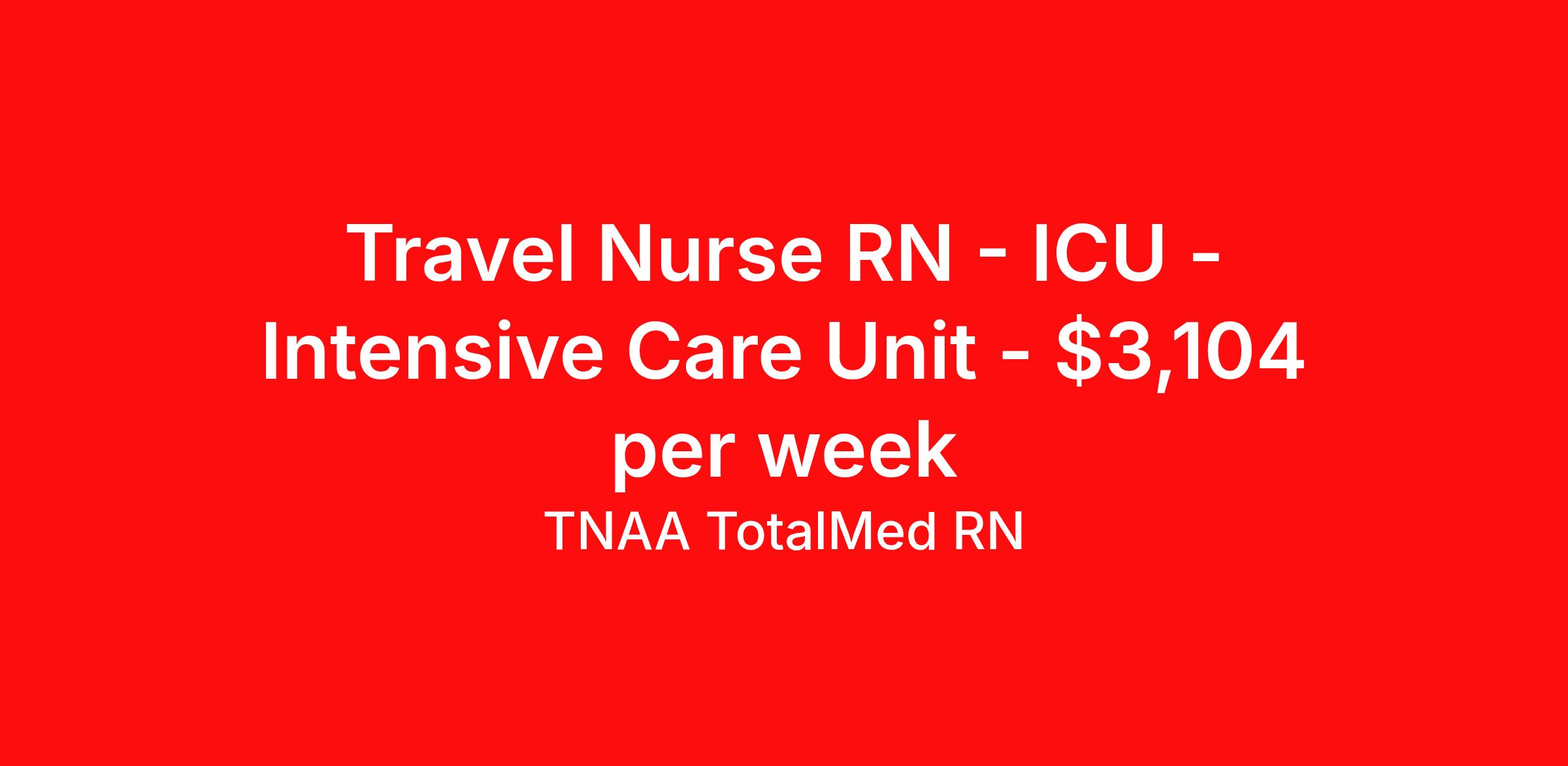 TNAA TotalMed RN is seeking a travel nurse RN ICU - Intensive Care Unit for a travel nursing job in Springfield, Massachusetts. Job Description & Requirements Specialty: ICU - Intensive Care Unit Discipline: RN Start Date: 04/20/2026 Duration: 13 weeks 48 hours per week Shift: 12 hours, nights Employment Type: Travel About TNAA TotalMed RN TotalMed is a Top Ten, travel nursing and healthcare staffing agency with the mission of igniting purpose in healthcare. The organization staffs nurses, therapists, pharmacists, and other clinicians of all specialties in all 50 states. They offer local and travel jobs and match caregivers with the right organization to assist both facilities and patients. As an organization, they focus on putting highly-skilled staff into facilities to ensure adequate staffing for a better patient experience. TotalMed specializes in recruiting and placing healthcare professionals in travel, PRN, and permanent positions across the country in Nursing and Allied Health. Throughout 2020, the organization filled roles at even the most short-staffed facilities during the most challenging time in healthcare. By matching the right travel healthcare professional with the right organization, TotalMed continues to offer a lifeline to facilities and their patients. Benefits Weekly pay Guaranteed Hours Continuing Education 401k retirement plan Sick pay Wellness and fitness programs Referral bonus Employee assistance programs Medical benefits Dental benefits Vision benefits Benefits start day 1
