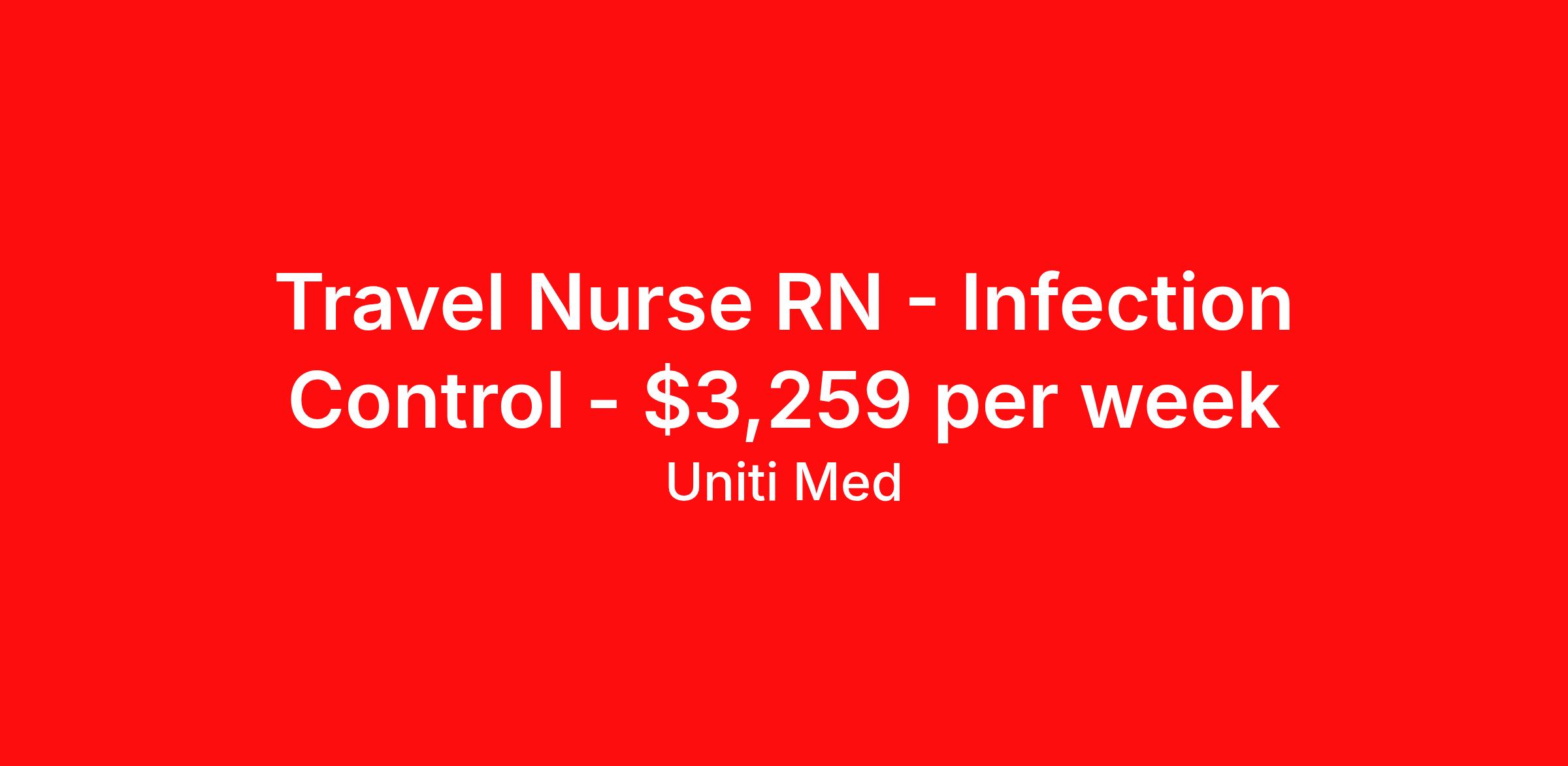Uniti Med is seeking a travel nurse RN Infection Control for a travel nursing job in Los Angeles California, California. Job Description & Requirements Specialty: Infection Control Discipline: RN Duration: 13 weeks 40 hours per week Shift: 8 hours, days Employment Type: Travel Patient ratios (if known): 265 bed facility and 3 IPs (This person would be the 3rd IP) and census run about 180 (very well staffed) 13-week contract 40 hours 5 x 8 ’s Required Work Experience: Must have at least 2 years of infection Prevention experience and on top of that to be a nurse (any specialty is fine) or a clinical lab specialist. Excellent and clear communication skillset required Hospital needs clear and meaningful communicators to improve their outcomes Must have inpatient experience About Uniti Med Uniti Med meticulously matches your talents to our open needs to ensure the ultimate travel experience. Tell us where you want to go and let our experienced staff lead the way! Benefits Referral bonus Benefits start day 1 Employee assistance programs