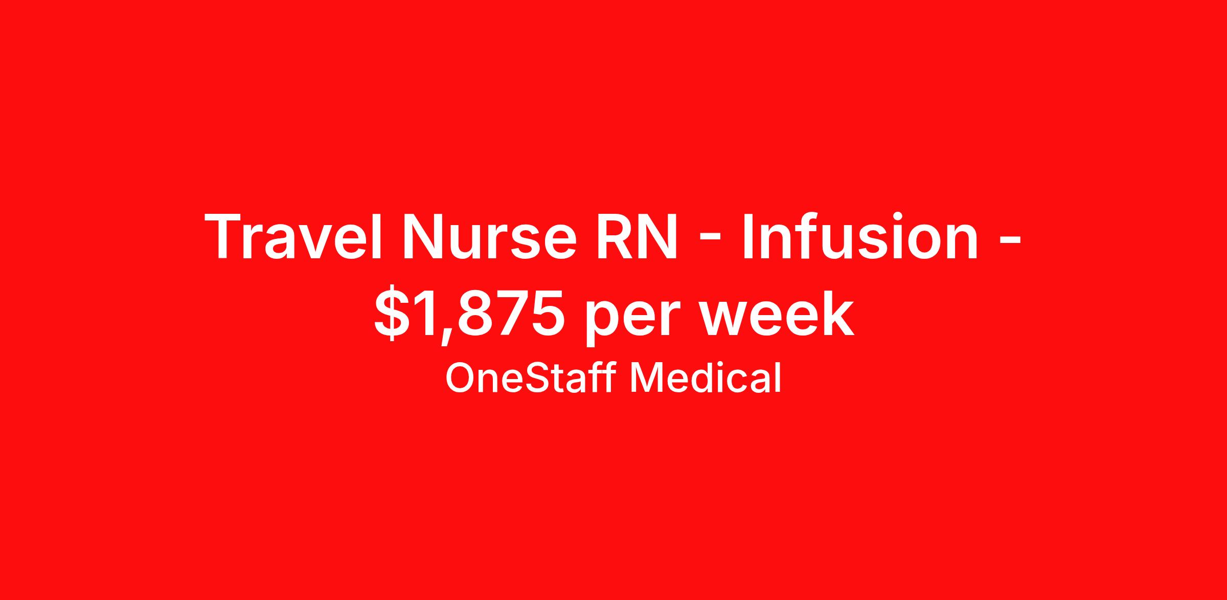 OneStaff Medical is seeking a travel nurse RN Infusion for a travel nursing job in Chapel Hill, North Carolina. Job Description & Requirements Specialty: Infusion Discipline: RN Start Date: 04/06/2026 Duration: 13 weeks 40 hours per week Shift: 10 hours, days Employment Type: Travel About OneStaff Medical You deserve a partner that is working for you. Be bold and let us do just that. We’ll take care of you while you are away from your own “home base” in every way we can, and ideally do more than you expect. Your team at OneStaff is dedicated to finding the perfect assignments (for you), negotiate the best rates and handles any issues that may arise while you are on assignment. We take great pride in building relationships with our traveling professionals and we enjoy hearing about your experiences. Whatever the need, we are here to help along the journey. We understand you are the heart and soul of what we are. Whether it is housing, payroll, travel, benefits, or just a friendly voice to talk to, we are there every step of the way. The company you choose is the most important decision you will make in your traveling career. We get that, so we’re committed to you 24 hours-a-day, 7 days-a-week. We’re your “one” solution in travel assignments and here to assist whether helping with accelerating your trajectory towards your career goals or meeting your travel requirements. Benefits Weekly pay Holiday Pay Guaranteed Hours 401k retirement plan Pet insurance Company provided housing options Sick pay Wellness and fitness programs Referral bonus Medical benefits Dental benefits Vision benefits
