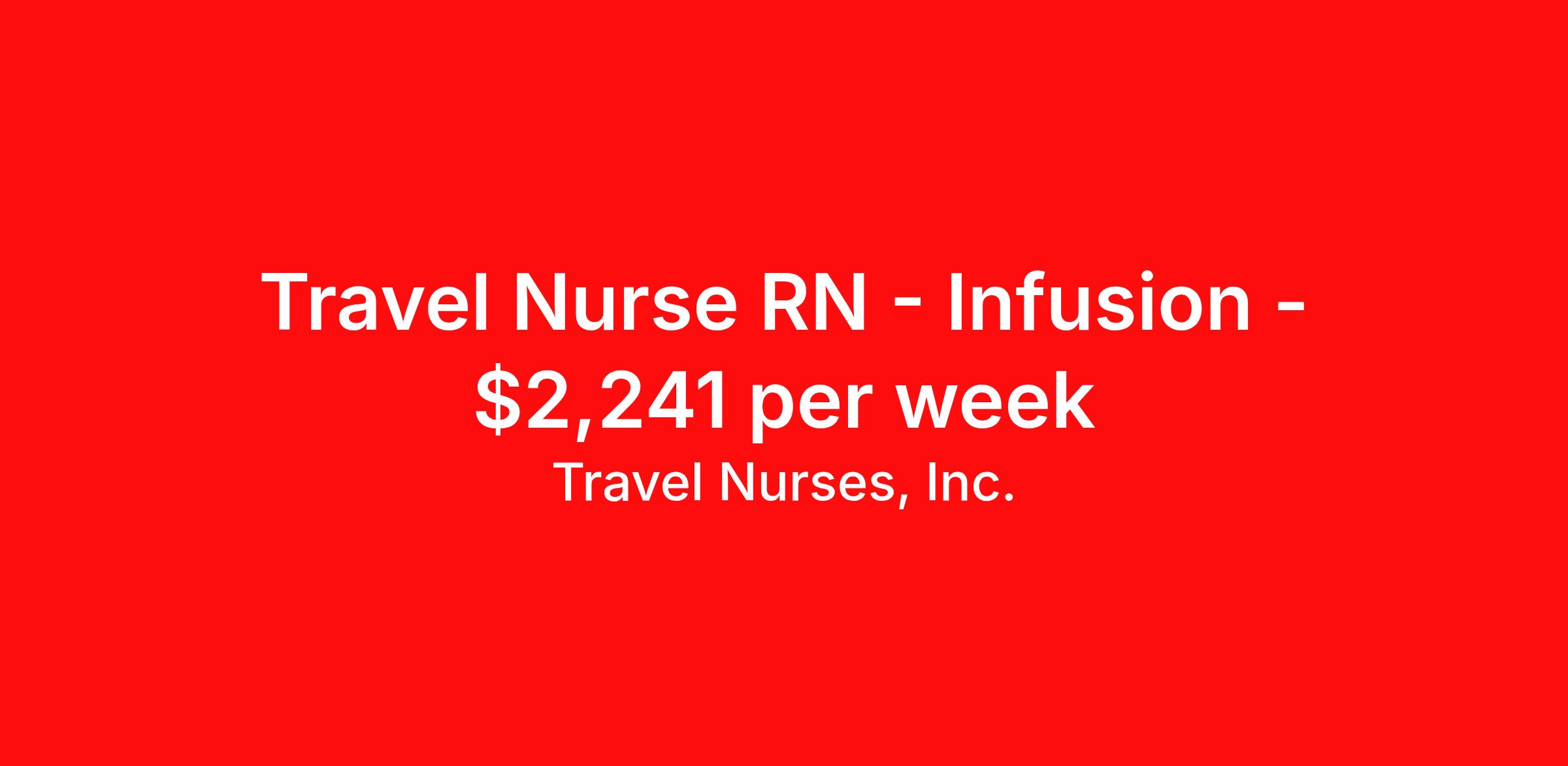 Travel Nurses, Inc. is seeking a travel nurse RN Infusion for a travel nursing job in Crescent City, California. Job Description & Requirements Specialty: Infusion Discipline: RN Start Date: 03/30/2026 Duration: 13 weeks 40 hours per week Shift: 8 hours Employment Type: Travel Travel Nurses, Inc. Job ID 306521. Pay package is based on 8 hour shifts and 40 hours per week (subject to confirmation) with tax-free stipend amount to be determined. Posted job title: Infusion Registered Nurse About Travel Nurses, Inc. Travel Nurses, Inc. is a leading healthcare staffing agency that provides healthcare professionals with opportunities to work across the country. Founded by nurses in 1988, TNI has more than 30 years of experience in the industry. The agency initially focused on staffing operating room settings in the MidSouth. However, this quickly evolved to encompass all nursing specialties and allied health fields nationwide. At the heart of our mission is a profound respect for nurses, whom we consider the cornerstone of healthcare. This acknowledgment extends beyond the nursing profession alone. Travel Nurses, Inc. now proudly embraces a wide array of healthcare professionals, recognizing their crucial roles in our collective mission. Travel Nurses, Inc. is dedicated to providing comprehensive support and opportunities that will help facilitate complete career mobility in the healthcare field. Our commitment to transparency ensures that all professionals, not just nurses, can confidently accept any assignment without financial uncertainties. We prioritize our professionals’ well-being with comprehensive benefits packages, including day-one healthcare coverage, competitive salaries, bonuses and incentives. This underscores our unwavering commitment to offering the best possible rewards and support for all the professionals we serve. Benefits Weekly pay Continuing Education 401k retirement plan Wellness and fitness programs Mileage reimbursement Referral bonus Employee assistance programs Medical benefits Dental benefits Vision benefits Benefits start day 1 License and certification reimbursement Life insurance Retention bonus
