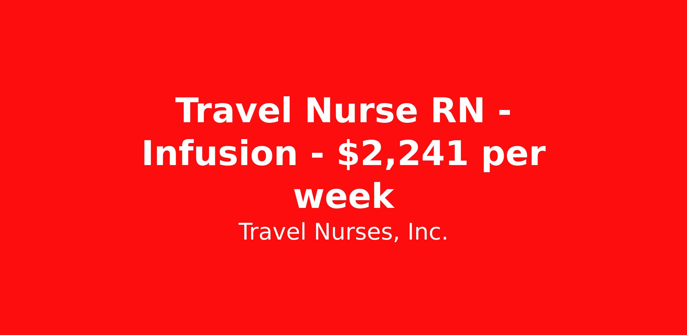 Travel Nurses, Inc. is seeking a travel nurse RN Infusion for a travel nursing job in Crescent City, California. Job Description & Requirements Specialty: Infusion Discipline: RN Start Date: 03/30/2026 Duration: 13 weeks 40 hours per week Shift: 8 hours Employment Type: Travel Travel Nurses, Inc. Job ID 306521. Pay package is based on 8 hour shifts and 40 hours per week (subject to confirmation) with tax-free stipend amount to be determined. Posted job title: Infusion Registered Nurse About Travel Nurses, Inc. Travel Nurses, Inc. is a leading healthcare staffing agency that provides healthcare professionals with opportunities to work across the country. Founded by nurses in 1988, TNI has more than 30 years of experience in the industry. The agency initially focused on staffing operating room settings in the MidSouth. However, this quickly evolved to encompass all nursing specialties and allied health fields nationwide. At the heart of our mission is a profound respect for nurses, whom we consider the cornerstone of healthcare. This acknowledgment extends beyond the nursing profession alone. Travel Nurses, Inc. now proudly embraces a wide array of healthcare professionals, recognizing their crucial roles in our collective mission. Travel Nurses, Inc. is dedicated to providing comprehensive support and opportunities that will help facilitate complete career mobility in the healthcare field. Our commitment to transparency ensures that all professionals, not just nurses, can confidently accept any assignment without financial uncertainties. We prioritize our professionals’ well-being with comprehensive benefits packages, including day-one healthcare coverage, competitive salaries, bonuses and incentives. This underscores our unwavering commitment to offering the best possible rewards and support for all the professionals we serve. Benefits Weekly pay Continuing Education 401k retirement plan Wellness and fitness programs Mileage reimbursement Referral bonus Employee assistance programs Medical benefits Dental benefits Vision benefits Benefits start day 1 License and certification reimbursement Life insurance Retention bonus