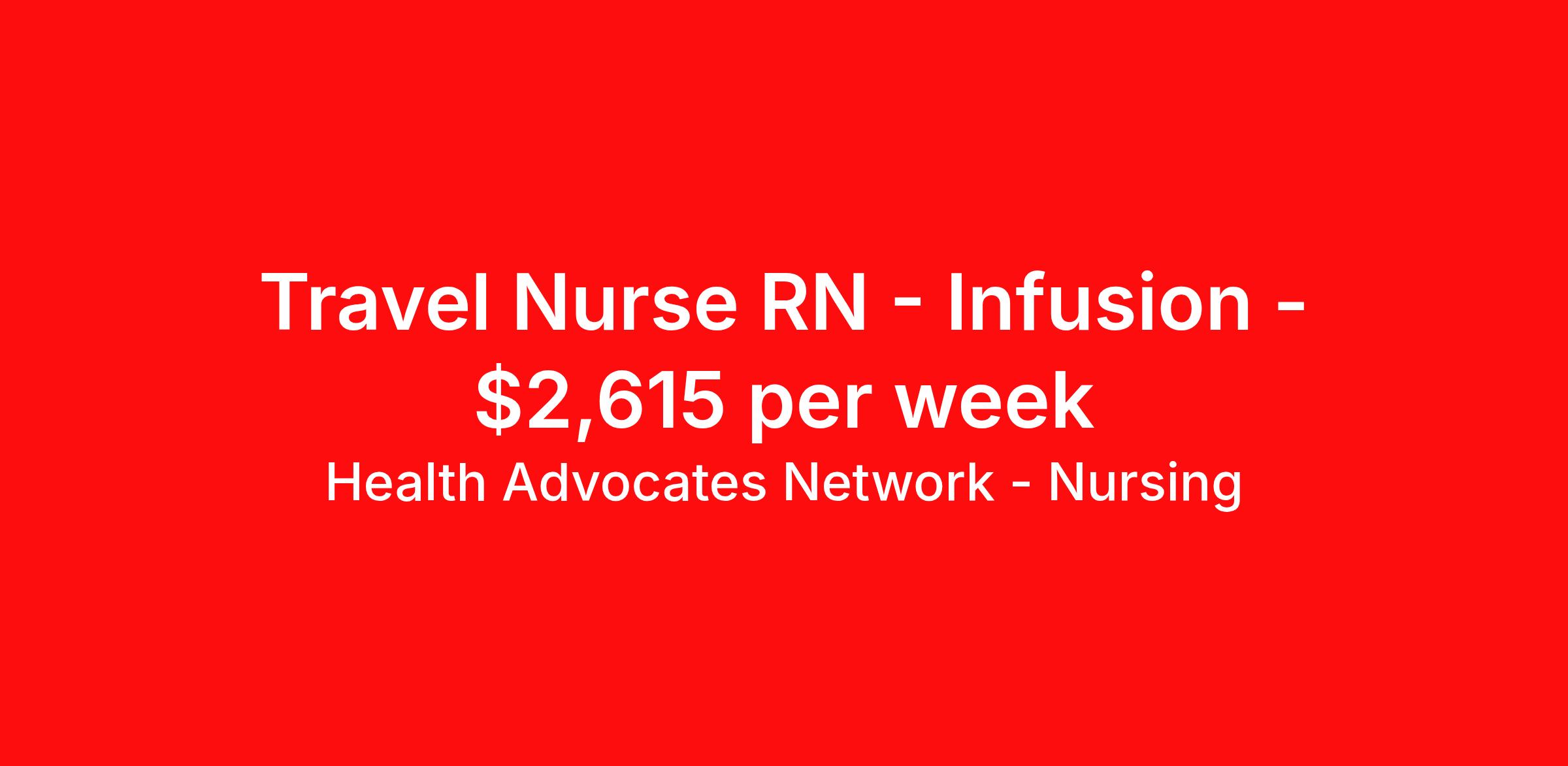 Health Advocates Network - Nursing is seeking a travel nurse RN Infusion for a travel nursing job in Glenwood Springs, Colorado. Job Description & Requirements Specialty: Infusion Discipline: RN Start Date: 03/31/2026 Duration: 13 weeks 40 hours per week Shift: 8 hours, days Employment Type: Travel Most have minimum of 3 year RN Infusion experience. Required Oncology Nursing Society Chemotherapy/Bio-therapy certification. BLS Chemo/Bio Thepay Cert. 5x8s Mon-Friday HANStaff Job ID 522559. Pay package is based on 8 hour shifts and 40 hours per week (subject to confirmation) with tax-free stipend amount to be determined. Posted job title: RN - Infusion About Health Advocates Network - Nursing Health Advocates Network was founded on the basis of a shared aspiration, to improve the way healthcare staffing is done. We are a company established and led by nurses. Our flexible approach enables us to develop solutions customized to your specific needs. From short- and long-term travel contracts to local and per diem assignments and more, we are here to get you to your next adventure! By solving challenges, providing the best placements, and advocating for you, we stand to help you thrive and pave the path forward in your career. Click on the videos below to learn more about our values!