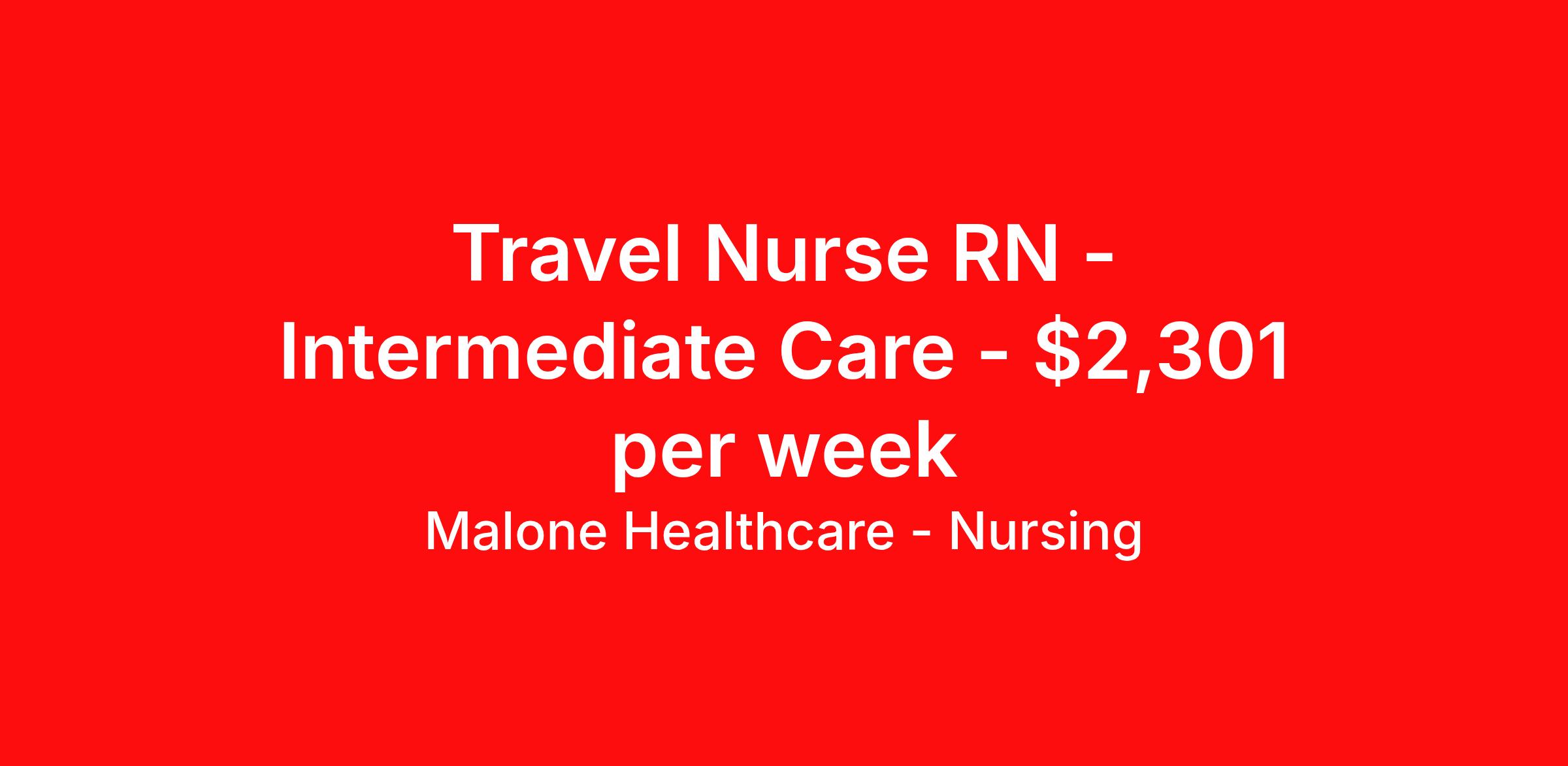Malone Healthcare - Nursing is seeking a travel nurse RN Intermediate Care for a travel nursing job in Utica, New York. Job Description & Requirements Specialty: Intermediate Care Discipline: RN Start Date: 04/06/2026 Duration: 13 weeks 36 hours per week Shift: 12 hours, days Employment Type: Travel About Malone Healthcare - Nursing With a commitment to providing a higher standard of service and experience in patient care, Malone Healthcare places expert nurses and allied health professionals in rewarding careers throughout the United States. As a leading healthcare staffing agency, Malone’s focus on compliance and integrity translates to a seamless experience for our team members and partner facilities. When you work with Malone Healthcare, you can rely on over 50 years of proven experience placing exceptional professionals in quality healthcare settings. Benefits Weekly pay Holiday Pay Guaranteed Hours Continuing Education 401k retirement plan Pet insurance Referral bonus Medical benefits Dental benefits Vision benefits License and certification reimbursement Life insurance