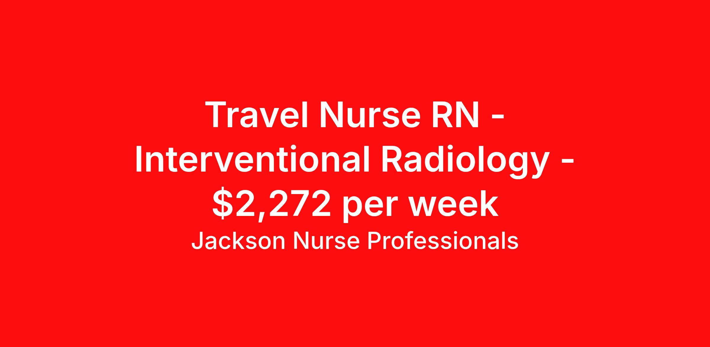 Jackson Nurse Professionals is seeking a travel nurse RN Interventional Radiology for a travel nursing job in Montgomery, Alabama. Job Description & Requirements Specialty: Interventional Radiology Discipline: RN Duration: 13 weeks 36 hours per week Shift: 12 hours, days Employment Type: Travel Seeking an IR RN with at least 2 years of recent experience for a 13 week contract assignment at a well known facility in Montgomery, AL. Total contract pay out: $29,536 About Jackson Nurse Professionals Filling critical needs in patient care, Jackson Nurse Professionals delivers cost-effective travel nurse staffing solutions to over 500 hospitals, outpatient clinics, and home health clients nationwide. Awarded Best of Staffing - Talent and Client 2024, and rated as a Top Workplace 2023 by the Orlando Sentinel, Jackson Nurse Professionals goes the extra mile to provide travel nurses the career they deserve, while providing clients with a large range of highly skilled nurses to fill short, long-term, and temporary assignments. As a member of Jackson Healthcare’s family of award-winning staffing companies, we’re part of a growing community that’s impacting 10 million patients nationwide. Join our mission to improve the delivery of patient care, and the lives of everyone we touch.
