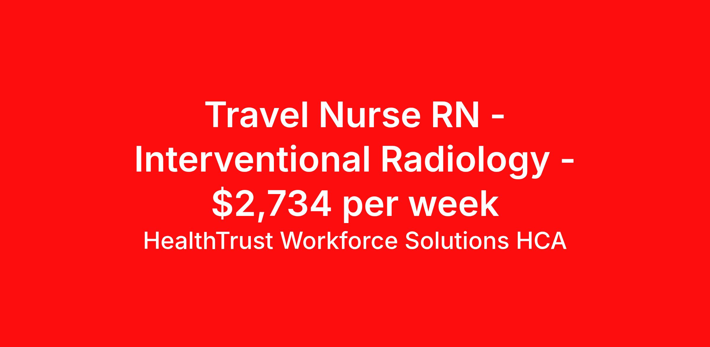 HealthTrust Workforce Solutions HCA is seeking a travel nurse RN Interventional Radiology for a travel nursing job in Denver, Colorado. Job Description & Requirements Specialty: Interventional Radiology Discipline: RN Start Date: 04/20/2026 Duration: 13 weeks 40 hours per week Shift: 10 hours, days Employment Type: Travel Shift: 7am-5:30pm Type of equipment – SIEMENS IR EMR - Meditech Preferred or nice to have : candidates with these skills will be considered first. 2 years’ experience, Experience with Siemens List typical procedures performed on unit(s): Y-90, Lines, Complex Biliary, Biopsies, Vascular No Neuro If you would like to move forward, please be ready to complete a skills checklist, assessments and profile with HealthTrust! Morgan Materne HealthTrust Workforce Solutions P: | E: About HealthTrust Workforce Solutions HCA At HealthTrust Workforce Solutions, healthcare is not just about the four walls of a facility but about the people who provide and receive care. Our focus is on empowering healthcare professionals to deliver exceptional patient experiences by providing them with the necessary skills, tools, and support. We partner with healthcare facilities nationwide to ensure that the right professionals are in the right roles. We prioritize our clinicians by giving them a voice and access to opportunities to fulfill their mission of improving lives by providing quality patient care. We are committed to our core values of Trust, Innovation, Adaptability, Courage, and Accountability. We are dedicated to positively impacting the healthcare industry by providing first-priority access to more than 200,000 jobs nationwide to our healthcare professionals. Join us and be part of the HealthTrust family, where you can make a difference every day. We embrace our changing environment, and we maintain a culture that has a rich tradition of transforming itself to meet the challenges of the future. MISSION STATEMENT While putting great people in the right roles is essential, our mission is far greater. We want our clinicians to be part of the HealthTrust family, where healthcare professionals have a voice and are empowered with the right tools and opportunities to fulfill their personal mission of improving lives. Plus, as a preferred partner to thousands of top-performing hospitals, we provide our healthcare professionals with first-priority access to more than 200,000 jobs nationwide. Benefits Dental benefits Vision benefits Referral bonus Continuing Education Life insurance