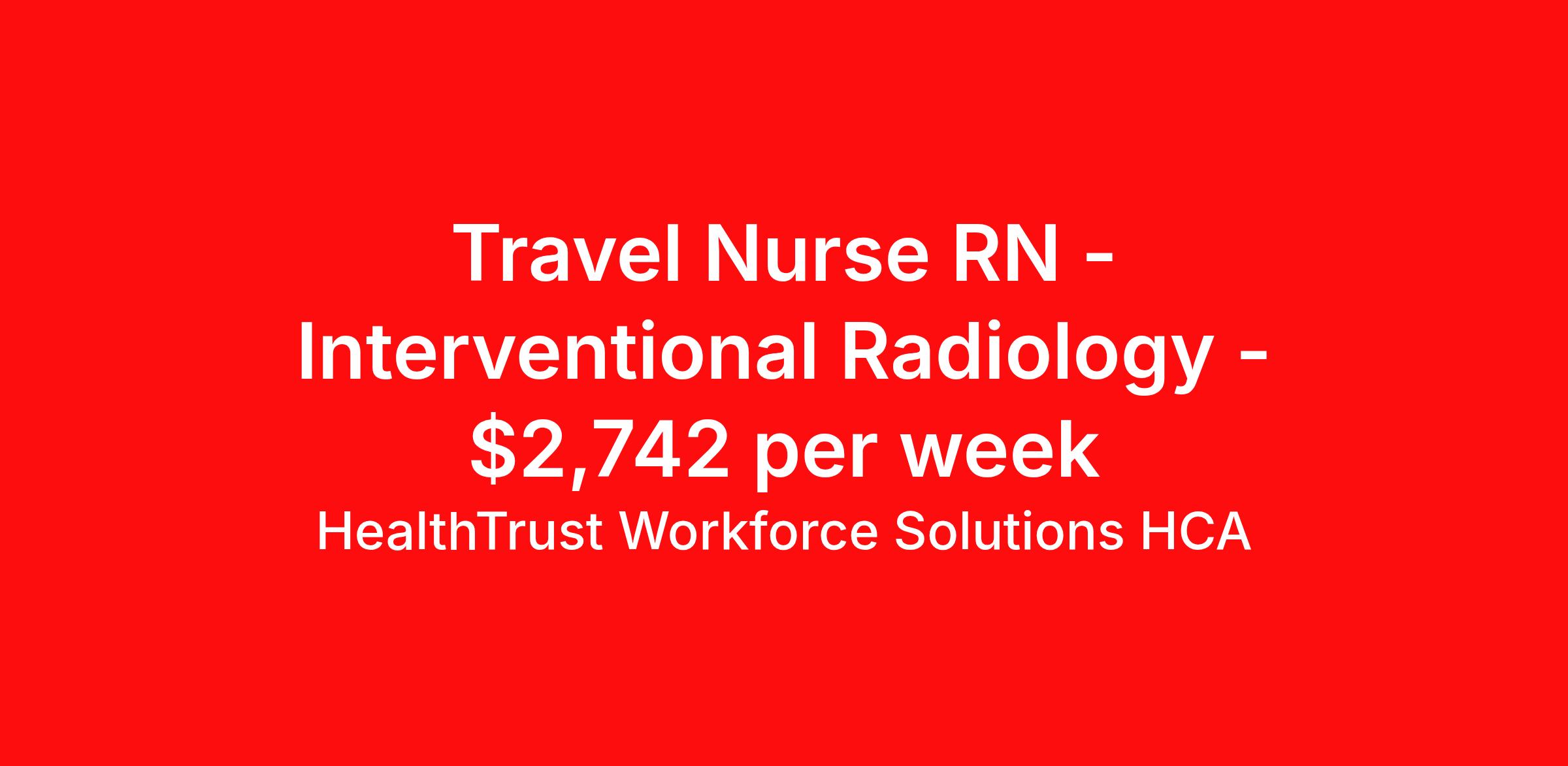 HealthTrust Workforce Solutions HCA is seeking a travel nurse RN Interventional Radiology for a travel nursing job in Bradenton, Florida. Job Description & Requirements Specialty: Interventional Radiology Discipline: RN Start Date: 03/30/2026 Duration: 13 weeks 40 hours per week Shift: 12 hours, days Employment Type: Travel About HealthTrust Workforce Solutions HCA At HealthTrust Workforce Solutions, healthcare is not just about the four walls of a facility but about the people who provide and receive care. Our focus is on empowering healthcare professionals to deliver exceptional patient experiences by providing them with the necessary skills, tools, and support. We partner with healthcare facilities nationwide to ensure that the right professionals are in the right roles. We prioritize our clinicians by giving them a voice and access to opportunities to fulfill their mission of improving lives by providing quality patient care. We are committed to our core values of Trust, Innovation, Adaptability, Courage, and Accountability. We are dedicated to positively impacting the healthcare industry by providing first-priority access to more than 200,000 jobs nationwide to our healthcare professionals. Join us and be part of the HealthTrust family, where you can make a difference every day. We embrace our changing environment, and we maintain a culture that has a rich tradition of transforming itself to meet the challenges of the future. MISSION STATEMENT While putting great people in the right roles is essential, our mission is far greater. We want our clinicians to be part of the HealthTrust family, where healthcare professionals have a voice and are empowered with the right tools and opportunities to fulfill their personal mission of improving lives. Plus, as a preferred partner to thousands of top-performing hospitals, we provide our healthcare professionals with first-priority access to more than 200,000 jobs nationwide. Benefits Dental benefits Vision benefits Referral bonus Continuing Education Life insurance