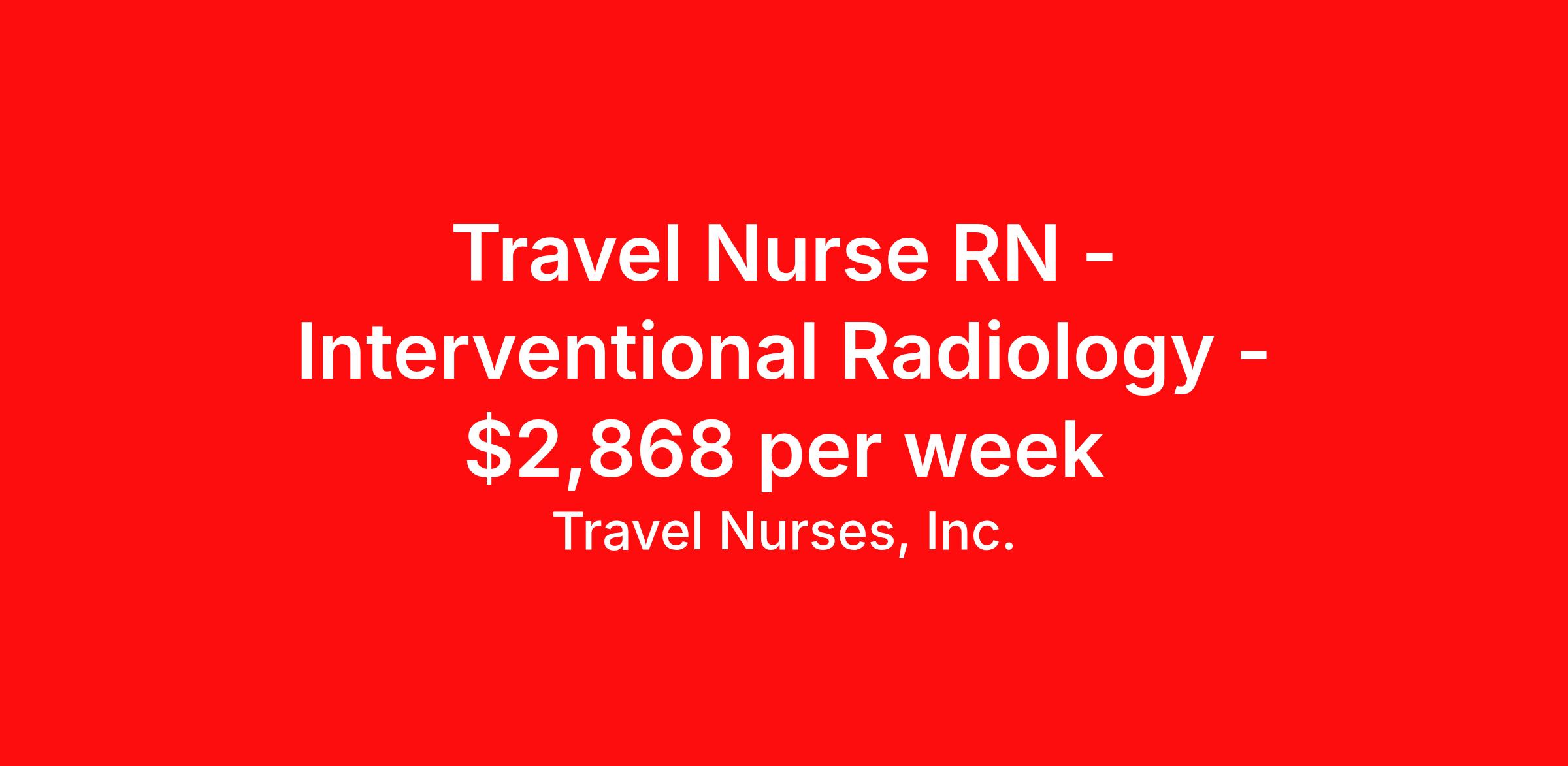 Travel Nurses, Inc. is seeking a travel nurse RN Interventional Radiology for a travel nursing job in Janesville, Wisconsin. Job Description & Requirements Specialty: Interventional Radiology Discipline: RN Start Date: ASAP Duration: 13 weeks 40 hours per week Shift: 8 hours Employment Type: Travel Travel Nurses, Inc. Job ID 308637. Pay package is based on 8 hour shifts and 40 hours per week (subject to confirmation) with tax-free stipend amount to be determined. Posted job title: Janesville, WI - Mercyhealth Hospital and Trauma Center - RN Cardiac Cath Lab - Days About Travel Nurses, Inc. Travel Nurses, Inc. is a leading healthcare staffing agency that provides healthcare professionals with opportunities to work across the country. Founded by nurses in 1988, TNI has more than 30 years of experience in the industry. The agency initially focused on staffing operating room settings in the MidSouth. However, this quickly evolved to encompass all nursing specialties and allied health fields nationwide. At the heart of our mission is a profound respect for nurses, whom we consider the cornerstone of healthcare. This acknowledgment extends beyond the nursing profession alone. Travel Nurses, Inc. now proudly embraces a wide array of healthcare professionals, recognizing their crucial roles in our collective mission. Travel Nurses, Inc. is dedicated to providing comprehensive support and opportunities that will help facilitate complete career mobility in the healthcare field. Our commitment to transparency ensures that all professionals, not just nurses, can confidently accept any assignment without financial uncertainties. We prioritize our professionals’ well-being with comprehensive benefits packages, including day-one healthcare coverage, competitive salaries, bonuses and incentives. This underscores our unwavering commitment to offering the best possible rewards and support for all the professionals we serve. Benefits Weekly pay Continuing Education 401k retirement plan Wellness and fitness programs Mileage reimbursement Referral bonus Employee assistance programs Medical benefits Dental benefits Vision benefits Benefits start day 1 License and certification reimbursement Life insurance Retention bonus