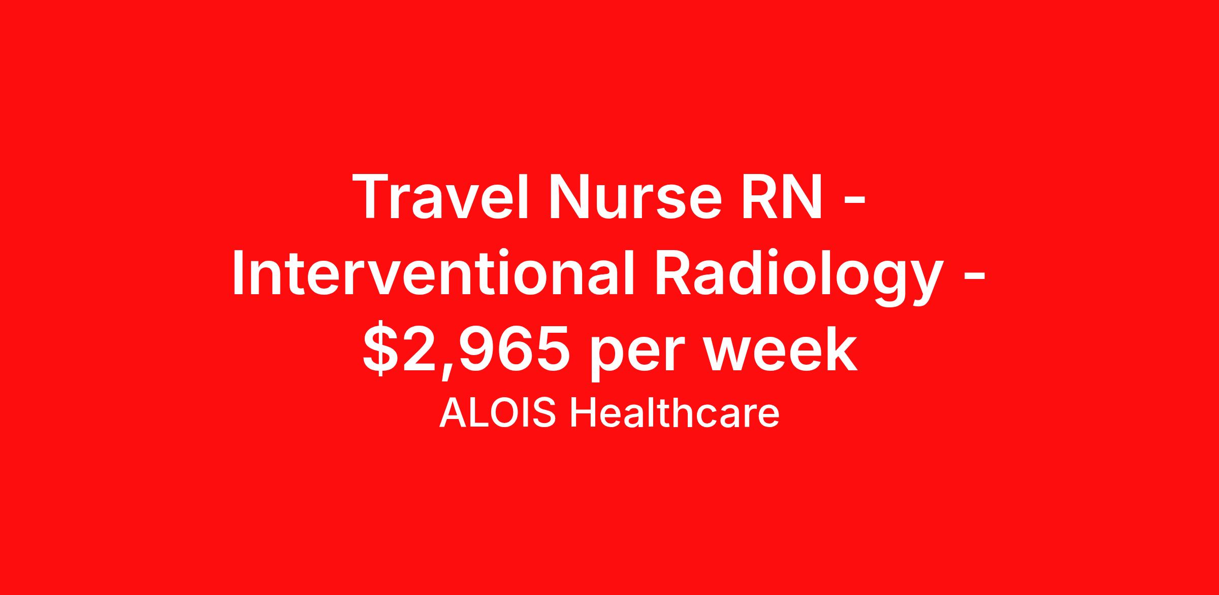 ALOIS Healthcare is seeking a travel nurse RN Interventional Radiology for a travel nursing job in West Glens Falls, New York. Job Description & Requirements Specialty: Interventional Radiology Discipline: RN Start Date: 04/16/2026 Duration: 13 weeks 40 hours per week Shift: 10 hours, days Employment Type: Travel An Interventional Radiology nurse is a specialized RN who assists the physician in these procedures. The nurse is responsible for patient care during the entire process, including the initial assessment, the plan of care, administering medication, checking for lab results, and reviewing the patient's medical history. ALOIS Healthcare Job ID 17834196. Pay package is based on 10 hour shifts and 40.0 hours per week (subject to confirmation) with tax-free stipend amount to be determined. Posted job title: RN Interventional Radiology About ALOIS Healthcare Why ALOIS Healthcare? ALOIS means “brave warrior” and that’s what you are- Warrior in Scrubs! Just as you advocate for your patients, we will advocate for you. The pay you deserve. The support you need. We’re in your corner for every battle – because you shouldn’t settle for anything less when it comes to your career. We offer: · Industry-leading pay Generous cost of living and housing stipends · Opportunities for referral, sign-on, and extension bonuses · Weekly health insurance or health insurance Marketplace weekly bonus · Continuing education credits We’re proud to be recognized globally as a certified minority-owned staffing supplier. At ALOIS Healthcare: · Everyone Matters · We are Performance Driven · We are Open, Honest and Direct · We are Transparent · We are Inclusive · We Do the Right Thing We care about you - and your success is our success.