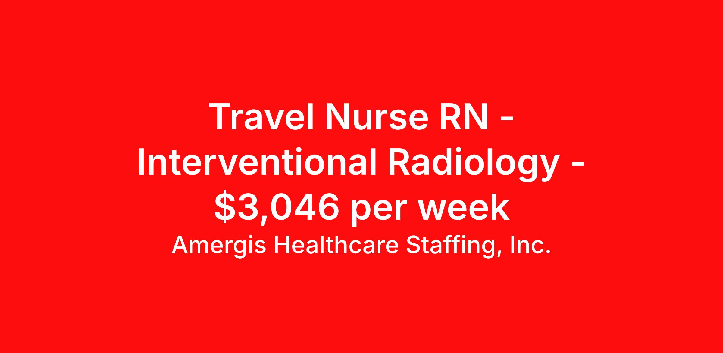 Amergis Healthcare Staffing, Inc. is seeking a travel nurse RN Interventional Radiology for a travel nursing job in Hermiston, Oregon. Job Description & Requirements Specialty: Interventional Radiology Discipline: RN Duration: 13 weeks 36 hours per week Shift: 12 hours Employment Type: Travel An Interventional Radiology Nurse is a specialized RN who assists the physician with medical imaging such as MRIs, ultrasounds or X-rays. The RN - Interventional Radiology is responsible for patient care during the entire process, including the initial assessment, the plan of care, administering medication, checking for lab results, and reviewing the patient’s medical history. Minimum Requirements: Current Registered Nurse License for the state in which the nurse practices. One year experience in Interventional Radiology preferred Current CPR if applicable TB Questionnaire, PPD or chest x-ray if applicable Current Health certificate (per contract or state regulation) Must meet all federal, state and local requirements Must be at least 18 years of age Benefits At Amergis, we firmly believe that our employees are the heartbeat of our organization and we are happy to offer the following benefits: Competitive pay & weekly paychecks Health, dental, vision, and life insurance 401(k) savings plan Awards and recognition programs *Benefit eligibility is dependent on employment status. About Amergis Amergis, formerly known as Maxim Healthcare Staffing, has served our clients and communities by connecting people to the work that matters since 1988. We provide meaningful opportunities to our extensive network of healthcare and school-based professionals, ready to work in any hospital, government facility, or school. Through partnership and innovation, Amergis creates unmatched staffing experiences to deliver the best workforce solutions. Amergis is an equal opportunity/affirmative action employer. All qualified applicants will receive consideration for employment without regard to sex, gender identity, sexual orientation, race, color, religion, national origin, disability, protected Veteran status, age, or any other characteristic protected by law. Amergis Job ID 1110606. Pay package is based on 12 hour shifts and 36 hours per week (subject to confirmation) with tax-free stipend amount to be determined. Posted job title: RN - Interventional Radiology - $3046/wk - 36hrs About Amergis Healthcare Staffing, Inc. Amergis, formerly known as Maxim Healthcare Staffing, has served our clients and communities by connecting people to the work that matters since 1988. We provide meaningful opportunities to our extensive network of healthcare and school-based professionals, ready to work in any hospital, government facility, or school. Through partnership and innovation, Amergis creates unmatched staffing experiences to deliver the best workforce solutions.