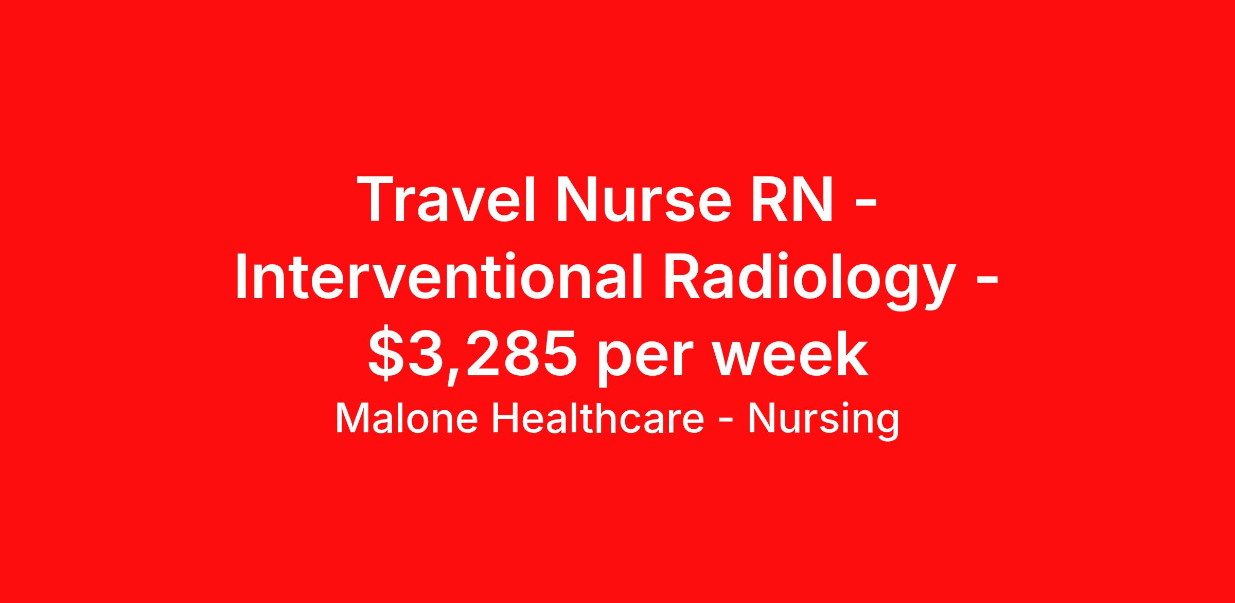 Malone Healthcare - Nursing is seeking a travel nurse RN Interventional Radiology for a travel nursing job in Marshfield, Wisconsin. Job Description & Requirements Specialty: Interventional Radiology Discipline: RN Duration: 13 weeks 40 hours per week Shift: 8 hours, days, nights, flexible Employment Type: Travel To apply quickly before the position closes, please reach out to me at: Phone: Text: Valerian D’lima Malone Healthcare About Malone Healthcare - Nursing With a commitment to providing a higher standard of service and experience in patient care, Malone Healthcare places expert nurses and allied health professionals in rewarding careers throughout the United States. As a leading healthcare staffing agency, Malone’s focus on compliance and integrity translates to a seamless experience for our team members and partner facilities. When you work with Malone Healthcare, you can rely on over 50 years of proven experience placing exceptional professionals in quality healthcare settings. Benefits Weekly pay Holiday Pay Guaranteed Hours Continuing Education 401k retirement plan Pet insurance Referral bonus Medical benefits Dental benefits Vision benefits License and certification reimbursement Life insurance