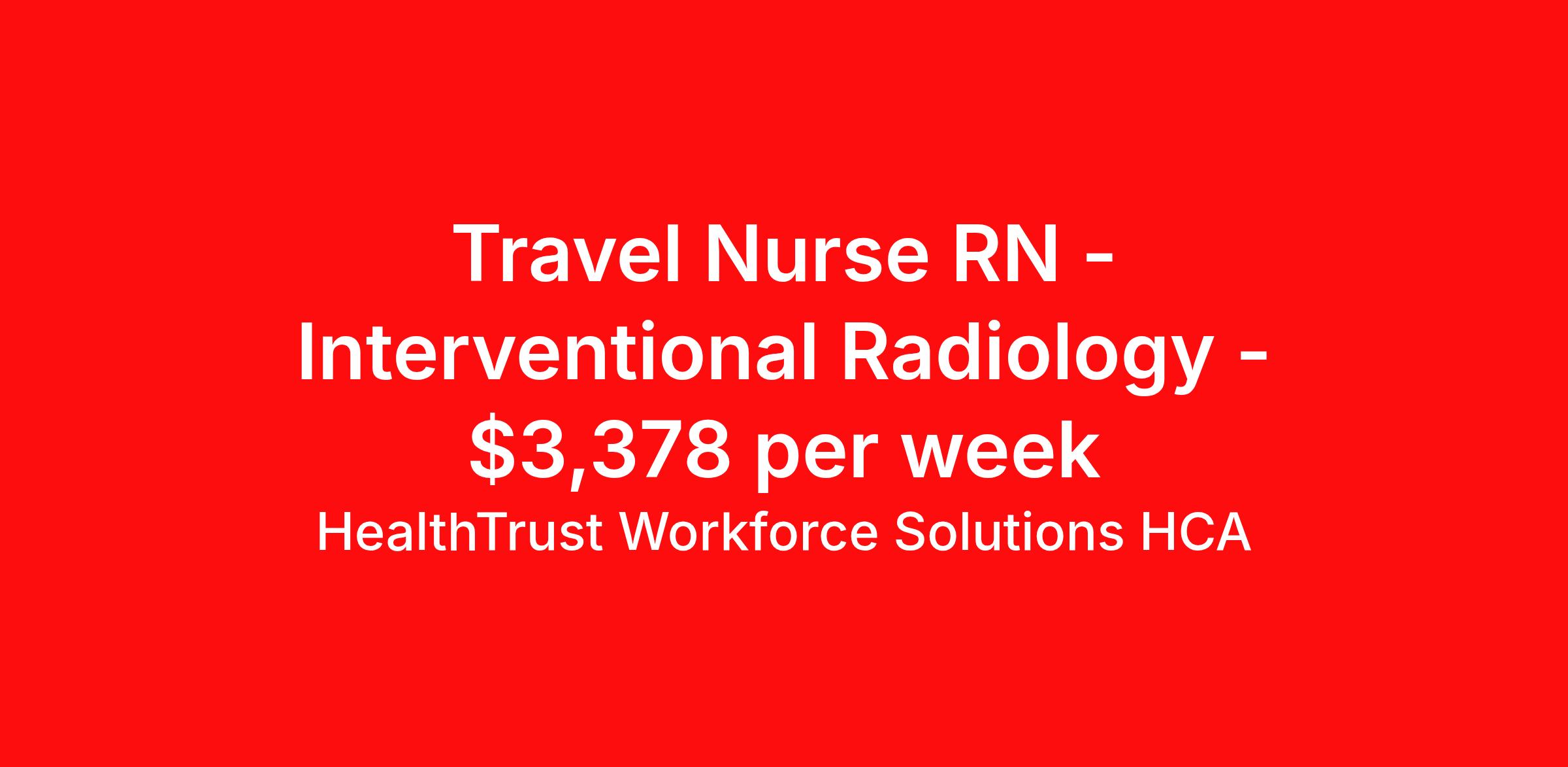 HealthTrust Workforce Solutions HCA is seeking a travel nurse RN Interventional Radiology for a travel nursing job in Richmond, Virginia. Job Description & Requirements Specialty: Interventional Radiology Discipline: RN Start Date: 03/30/2026 Duration: 13 weeks 40 hours per week Shift: 10 hours, days Employment Type: Travel Shift: 7:00AM - 5:00PM 2 YEARS EXPERIENCE IN A HOPSITAL SETTING REQUIRED MUST HAVE ACTIVE COMPACT LICENSE AT SUBMISSION BLS REQUIRED If you would like to move forward, please be ready to complete a skills checklist, assessments & profile with HealthTrust! About HealthTrust Workforce Solutions HCA At HealthTrust Workforce Solutions, healthcare is not just about the four walls of a facility but about the people who provide and receive care. Our focus is on empowering healthcare professionals to deliver exceptional patient experiences by providing them with the necessary skills, tools, and support. We partner with healthcare facilities nationwide to ensure that the right professionals are in the right roles. We prioritize our clinicians by giving them a voice and access to opportunities to fulfill their mission of improving lives by providing quality patient care. We are committed to our core values of Trust, Innovation, Adaptability, Courage, and Accountability. We are dedicated to positively impacting the healthcare industry by providing first-priority access to more than 200,000 jobs nationwide to our healthcare professionals. Join us and be part of the HealthTrust family, where you can make a difference every day. We embrace our changing environment, and we maintain a culture that has a rich tradition of transforming itself to meet the challenges of the future. MISSION STATEMENT While putting great people in the right roles is essential, our mission is far greater. We want our clinicians to be part of the HealthTrust family, where healthcare professionals have a voice and are empowered with the right tools and opportunities to fulfill their personal mission of improving lives. Plus, as a preferred partner to thousands of top-performing hospitals, we provide our healthcare professionals with first-priority access to more than 200,000 jobs nationwide. Benefits Dental benefits Vision benefits Referral bonus Continuing Education Life insurance