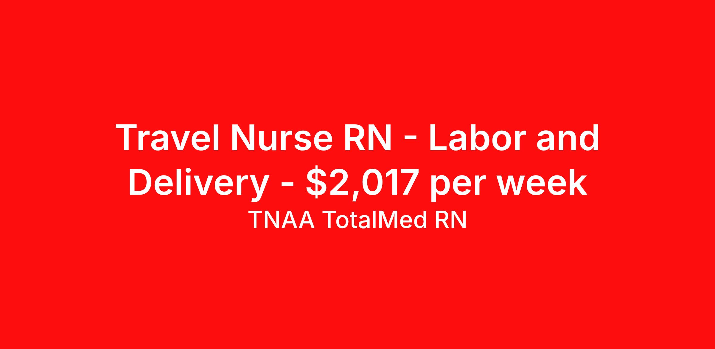 TNAA TotalMed RN is seeking a travel nurse RN Labor and Delivery for a travel nursing job in Key West, Florida. Job Description & Requirements Specialty: Labor and Delivery Discipline: RN Start Date: 04/13/2026 Duration: 13 weeks 36 hours per week Shift: 12 hours, nights Employment Type: Travel About TNAA TotalMed RN TotalMed is a Top Ten, travel nursing and healthcare staffing agency with the mission of igniting purpose in healthcare. The organization staffs nurses, therapists, pharmacists, and other clinicians of all specialties in all 50 states. They offer local and travel jobs and match caregivers with the right organization to assist both facilities and patients. As an organization, they focus on putting highly-skilled staff into facilities to ensure adequate staffing for a better patient experience. TotalMed specializes in recruiting and placing healthcare professionals in travel, PRN, and permanent positions across the country in Nursing and Allied Health. Throughout 2020, the organization filled roles at even the most short-staffed facilities during the most challenging time in healthcare. By matching the right travel healthcare professional with the right organization, TotalMed continues to offer a lifeline to facilities and their patients. Benefits Weekly pay Guaranteed Hours Continuing Education 401k retirement plan Sick pay Wellness and fitness programs Referral bonus Employee assistance programs Medical benefits Dental benefits Vision benefits Benefits start day 1