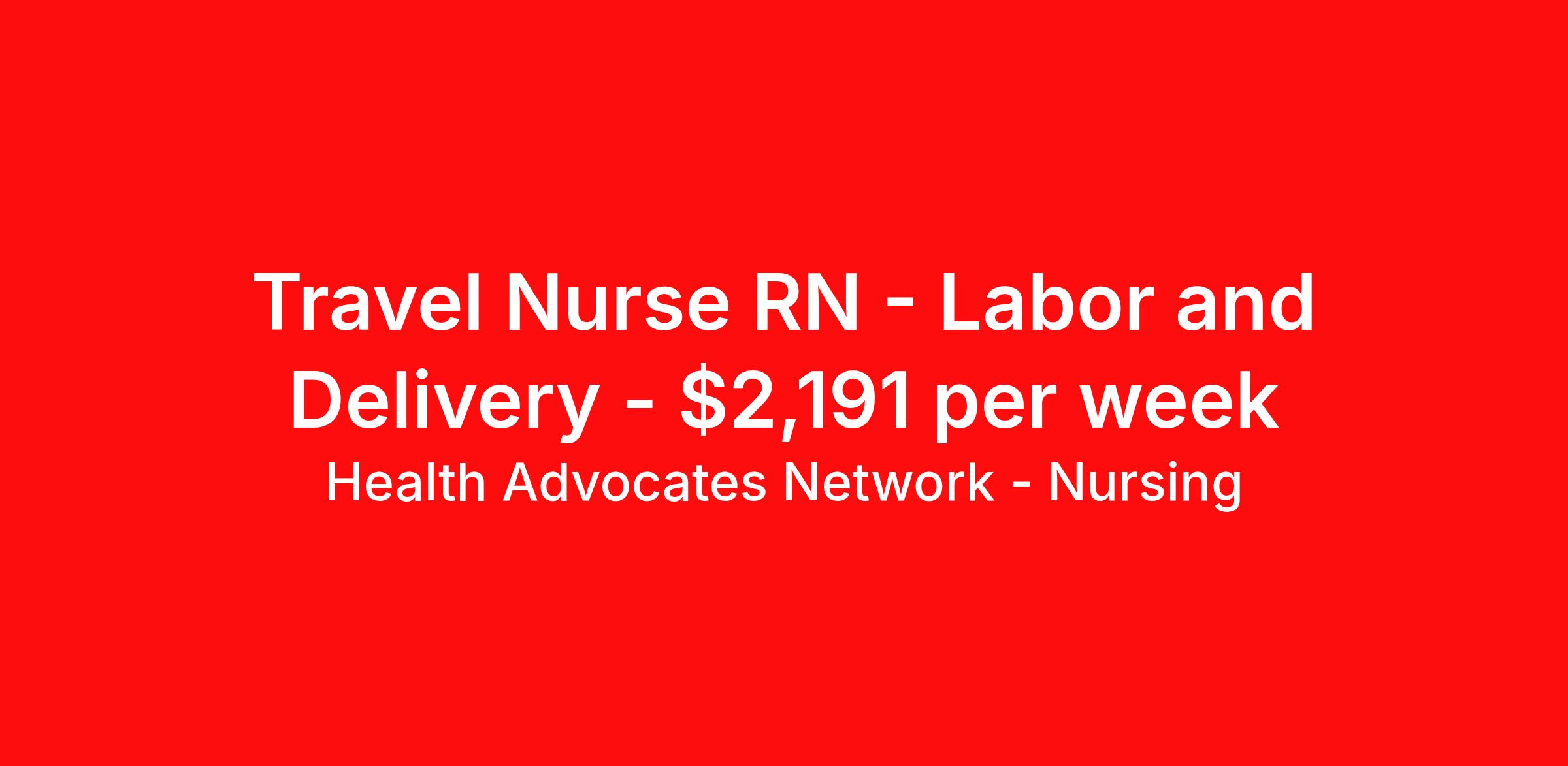 Health Advocates Network - Nursing is seeking a travel nurse RN Labor and Delivery for a travel nursing job in Rutherfordton, North Carolina. Job Description & Requirements Specialty: Labor and Delivery Discipline: RN Start Date: 03/23/2026 Duration: 13 weeks 36 hours per week Shift: 12 hours, nights Employment Type: Travel RN – Labor and Delivery L&D Registered Nurse - Health Advocates Network is urgently hiring Labor and Delivery L&D RNs with at least 2 years of recent experience! IMMEDIATE STARTS! Travel packages up to $2,191 weekly 12HR NIGHT shifts available 13 week contracts available Specialty: Labor and Delivery L&D Registered Nurse (RN) Requirements: Active NC State or Compact Registered Nurse License if applicable ACLS, BLS, PALS, NRP, STABLE, AWHON Fetal Monitoring Graduate of an Accredited School of Nursing Additional certifications may be required Benefits We Offer: Competitive pay rates, Referral Bonus, Medical, Dental and Vision. Travel reimbursement and per diem allowances, Employee discounts, educational opportunities, and more! To apply for this job now or to find out more about other opportunities with Health Advocates Network, Inc. reply to this posting, contact us at or call/text . We can provide you unparalleled access to exciting career opportunities. Health Advocates Network, Inc . is an equal opportunity employer. All qualified applicants shall receive consideration for employment without regard to any legally protected basis protected by applicable federal or state law except where a bona fide occupational qualification applies. Refer a Registered Nurse for a $1,000.00 bonus opportunity! HANStaff Job ID 517064. Pay package is based on 12 hour shifts and 36 hours per week (subject to confirmation) with tax-free stipend amount to be determined. Posted job title: RN - L & D About Health Advocates Network - Nursing Health Advocates Network was founded on the basis of a shared aspiration, to improve the way healthcare staffing is done. We are a company established and led by nurses. Our flexible approach enables us to develop solutions customized to your specific needs. From short- and long-term travel contracts to local and per diem assignments and more, we are here to get you to your next adventure! By solving challenges, providing the best placements, and advocating for you, we stand to help you thrive and pave the path forward in your career. Click on the videos below to learn more about our values!