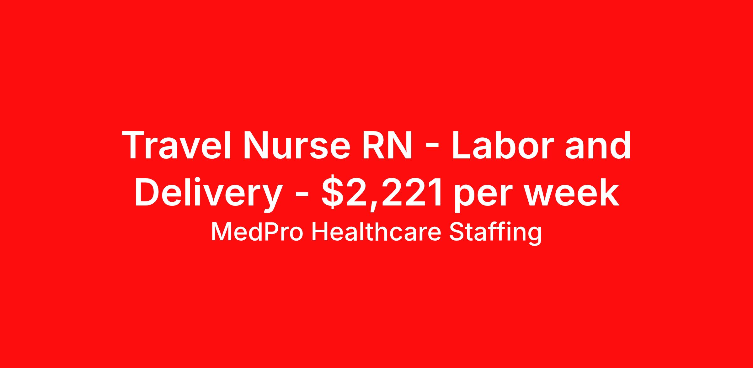 MedPro Healthcare Staffing is seeking a travel nurse RN Labor and Delivery for a travel nursing job in La Plata, Maryland. Job Description & Requirements Specialty: Labor and Delivery Discipline: RN Start Date: 05/04/2026 Duration: 13 weeks 36 hours per week Shift: 12 hours, nights Employment Type: Travel MedPro Healthcare Staffing , a Joint Commission-certified staffing agency, is seeking a quality Labor & Delivery Registered Nurse for a travel assignment with one of our top healthcare clients. Requirements Active RN License Degree from accredited nursing program BLS, ACLS, NRP, PALS AWHONN Certifications Eighteen months of recent experience in an Acute Care Labor and Delivery (L&D) setting Other requirements to be determined by our client facility Benefits Weekly pay and direct deposit Full coverage of all credentialing fees Private housing or housing allowance Group Health insurance for you and your family Company-paid life and disability insurance Travel reimbursement 401(k) matching Unlimited Referral Bonuses up to $1,000 Duties Responsibilities Labor and Delivery Nurses (RN), also called perinatal nurses, provide care and support for women before, during and after delivery of the baby. They are responsible for making sure that the medical as well as the emotional needs of the patient are adequately met throughout the entire birthing process. Labor and Delivery (LD) nurses provide care to women and their newborns during the antepartum, intrapartum, postpartum and neonatal stages. Monitor vital signs of the mother and baby during birth. Monitor patients for potential high risk problems. Educate and support mothers and their families after giving birth. About Agency MedPro Healthcare Staffing is a Joint Commission certified provider of contract staffing services. Since 1983, we have placed nursing and allied travelers in top healthcare facilities nationwide. Join us today for your very own MedPro Experience®. If qualified and interested, please call for immediate consideration. MedPro Staffing is an Equal Opportunity Employer. All applicants will be considered for employment without attention to race, color, religion, national origin, age, sex, disability, marital status or veteran status. Key Words: Registered Nurse, RN, Labor & Delivery, Contract Nurse, Travel Nurse, Agency RN, Travel RN, Nursing, Contract, L&D, Labor and Delivery, LD *Weekly payment estimates are intended for informational purposes only and include a gross estimate of hourly wages and reimbursements for meal, incidental, and housing expenses. Your recruiter will confirm your eligibility and provide additional details. MedPro Job ID a0Fcx00000IEYYvEAP. Pay package is based on 12 hour shifts and 36 hours per week (subject to confirmation) with tax-free stipend amount to be determined. Posted job title: Labor & Delivery Registered Nurse Nursing: Labor and Delivery. About MedPro Healthcare Staffing At MedPro Healthcare Staffing , we believe no one cares more for caregivers than we do. Our mission is simple: you focus on your patients, and we’ll take care of the rest. As a Joint Commission-certified leader in temporary and contract healthcare staffing since 1983, MedPro has proudly connected nursing and allied travelers with top healthcare facilities across the nation. With thousands of job opportunities available nationwide, we make it easy to find assignments that align with your goals and lifestyle. Our on-staff clinical support team—alongside a compassionate group of experienced recruiters—provides hands-on guidance every step of the way. From Day 1 medical benefits and a 401(k) plan to personalized career support, we’re committed to ensuring every professional we serve feels valued, cared for, and empowered to succeed. Guided by a CEO who is a Registered Nurse, MedPro is built on a foundation of clinical insight and genuine compassion for the caregiving community. Through The MedPro Experience® , we deliver travel assignments that are rewarding, memorable, and designed to help you DREAM big, EXPLORE often, and ACHIEVE greatness. Benefits Day 1 medical, dental, and vision benefits for you and your family Weekly pay and direct deposit Unlimited Referral Bonuses starting at $500 On Staff Clinical Support Team Access to nationwide travel assignments MPX Mobile app -24/7 real-time access to jobs, credentials, assignment details, and more Full coverage of all credentialing fees Private housing or housing allowance Tax Free Per Diems, Housing Stipends and Travel Reimbursements Company-paid life and disability insurance Travel reimbursement 401(k) matching Benefits Weekly pay Referral bonus Employee assistance programs