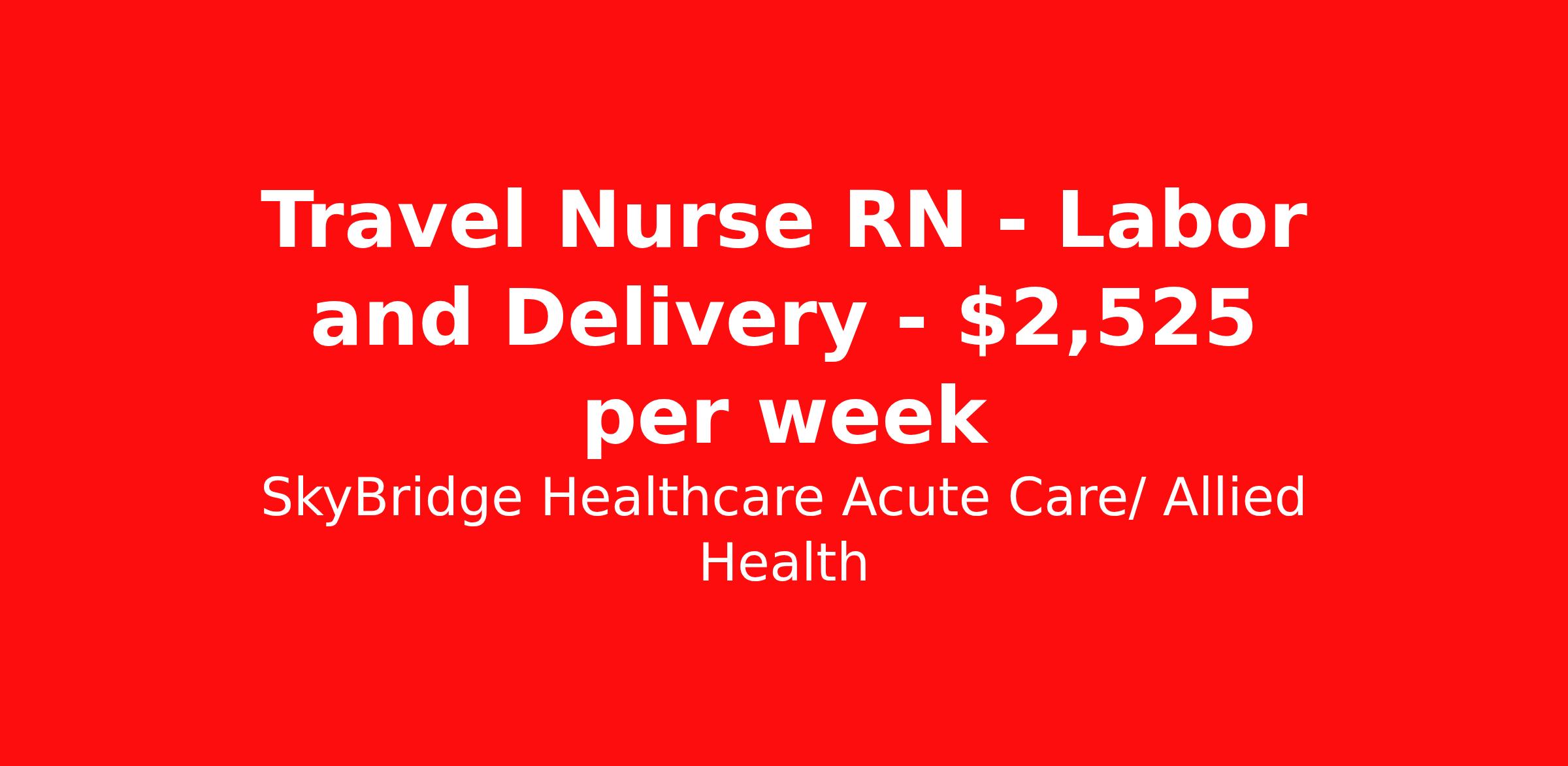 SkyBridge Healthcare Acute Care/ Allied Health is seeking a travel nurse RN Labor and Delivery for a travel nursing job in Sioux City, Iowa. Job Description & Requirements Specialty: Labor and Delivery Discipline: RN Duration: 13 weeks 36 hours per week Shift: 12 hours, nights Employment Type: Travel SkyBridge Healthcare Acute Care/ Allied Health Job ID 48831KPA. Pay package is based on 12 hour shifts and 36 hours per week (subject to confirmation) with tax-free stipend amount to be determined. About SkyBridge Healthcare Acute Care/ Allied Health It is our mission at SkyBridge Healthcare to connect professionals within the healthcare community through both genuine relationships and quality work. We understand the demands of healthcare positions which is why we want to give back to Healthcare Professionals who give so much to their communities. We’re partnered with some of the greatest facilities in the nation, therefore we ensure our Healthcare Professionals will receive top-notch treatment every step of the way. Our specialties include Nursing, Allied Health, Laboratory, Therapy, Healthcare Information Technology, and Revenue Cycle. Follow us on social media to stay in the know of our latest company updates and job postings. Benefits Weekly pay Holiday Pay Guaranteed Hours Vision benefits 401k retirement plan License and certification reimbursement Mileage reimbursement Referral bonus Employee assistance programs Medical benefits Life insurance Dental benefits