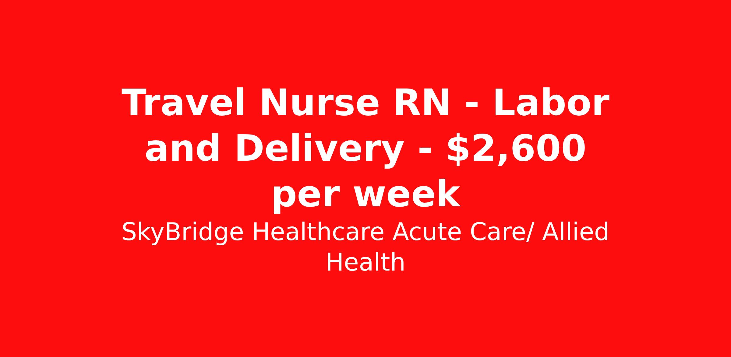 SkyBridge Healthcare Acute Care/ Allied Health is seeking a travel nurse RN Labor and Delivery for a travel nursing job in Omaha, Nebraska. Job Description & Requirements Specialty: Labor and Delivery Discipline: RN Duration: 13 weeks 36 hours per week Shift: 12 hours, nights Employment Type: Travel SkyBridge Healthcare Acute Care/ Allied Health Job ID ML714501MS. Pay package is based on 12 hour shifts and 36 hours per week (subject to confirmation) with tax-free stipend amount to be determined. About SkyBridge Healthcare Acute Care/ Allied Health It is our mission at SkyBridge Healthcare to connect professionals within the healthcare community through both genuine relationships and quality work. We understand the demands of healthcare positions which is why we want to give back to Healthcare Professionals who give so much to their communities. We’re partnered with some of the greatest facilities in the nation, therefore we ensure our Healthcare Professionals will receive top-notch treatment every step of the way. Our specialties include Nursing, Allied Health, Laboratory, Therapy, Healthcare Information Technology, and Revenue Cycle. Follow us on social media to stay in the know of our latest company updates and job postings. Benefits Weekly pay Holiday Pay Guaranteed Hours Vision benefits 401k retirement plan License and certification reimbursement Mileage reimbursement Referral bonus Employee assistance programs Medical benefits Life insurance Dental benefits