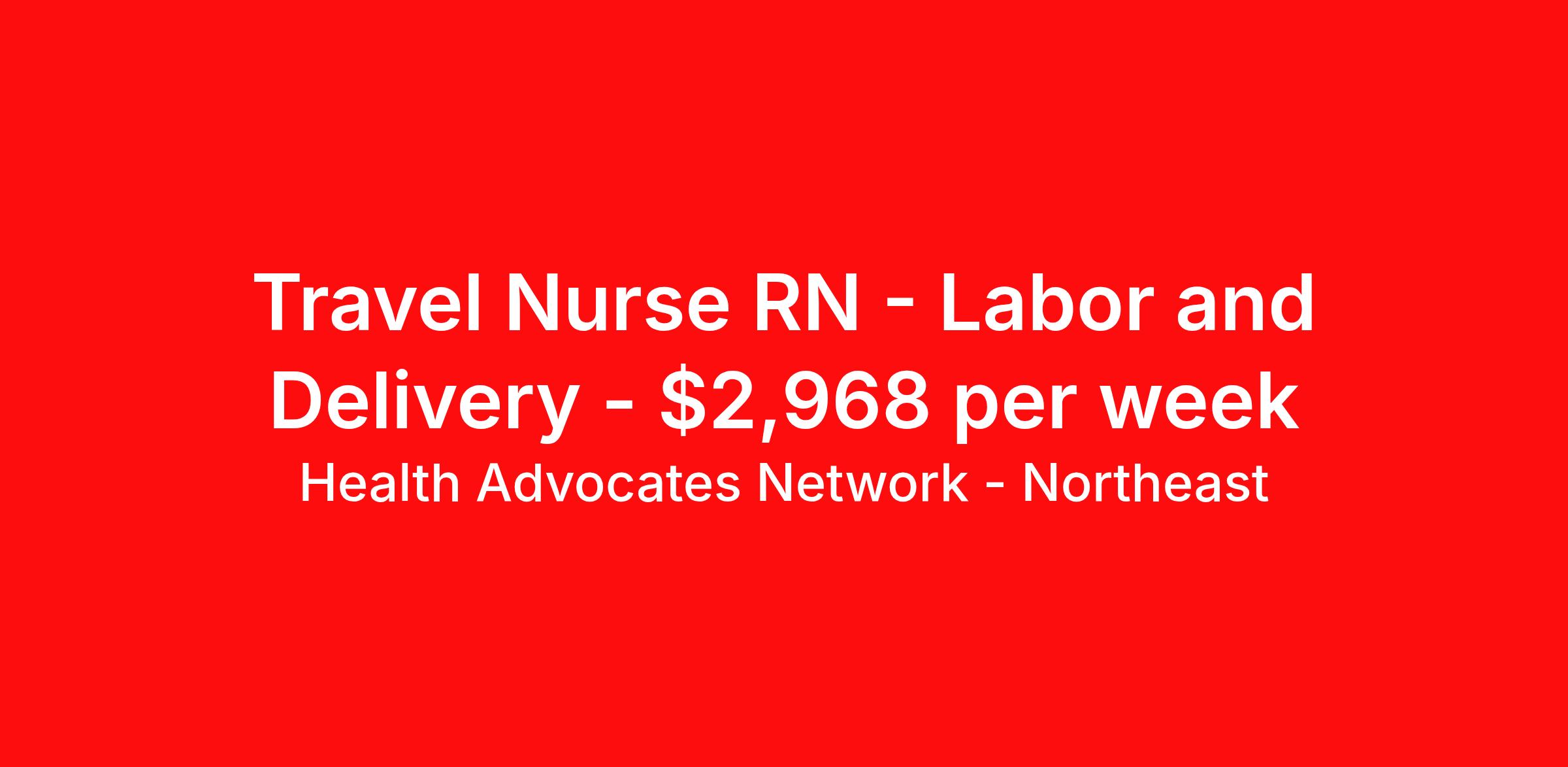 Health Advocates Network - Northeast is seeking a travel nurse RN Labor and Delivery for a travel nursing job in Albany, New York. Job Description & Requirements Specialty: Labor and Delivery Discipline: RN Start Date: 03/27/2026 Duration: 12 weeks 36 hours per week Shift: 12 hours, nights Employment Type: Travel Health Advocates Network is urgently hiring L & D Registered Nurses (RNs) in the Albany, NY area. Must have 2 years L & D experience. Pay Rate: $2,968 weekly Specialty: L & D Registered Nurse (RN) Shift: Night 13 Week Contracts and more available! Qualification and Requirements: Authorized to work in the United States. Graduate of an Accredited School of Nursing 2 years of experience as a L & D Registered Nurse (RN) American Heart Association BLS An active, current (NY) state license Apply for this job now or to find out more about other opportunities with Health Advocates Network, Inc. reply to this posting, contact us at or call/text . We can provide you unparalleled access to exciting career opportunities. Benefits We Offer: Competitive pay rates, Referral Bonus, Medical, Dental, Vision and 401k. Travel reimbursement and per diem allowances, Employee discounts, educational opportunities, and more! Who We Are: Health Advocates Network matches highly skilled applicants to positions at the best healthcare companies on a temporary and temporary-to-hire basis. Our mission is to provide you with a rewarding job that is well-matched to your skills – helping you advance in your career. Our experience, combined with our client relationships, makes Health Advocates Network a great resource for your career. Health Advocates Network, Inc. is an equal-opportunity employer. All qualified applicants shall receive consideration for employment without regard to any legally protected basis protected by applicable federal or state law except where a bona fide occupational qualification applies. Refer a Registered Nurse for a $1000.00 bonus opportunity! HANStaff Northeast Job ID 513772. Pay package is based on 12 hour shifts and 36 hours per week (subject to confirmation) with tax-free stipend amount to be determined. Posted job title: RN - L & D About Health Advocates Network - Northeast Health Advocates Network was founded on the basis of a shared aspiration, to improve the way healthcare staffing is done. We are a company established and led by nurses. Our flexible approach enables us to develop solutions customized to your specific needs. From short- and long-term travel contracts to local and per diem assignments and more, we are here to get you to your next adventure! By solving challenges, providing the best placements, and advocating for you, we stand to help you thrive and pave the path forward in your career. Benefits 401k retirement plan