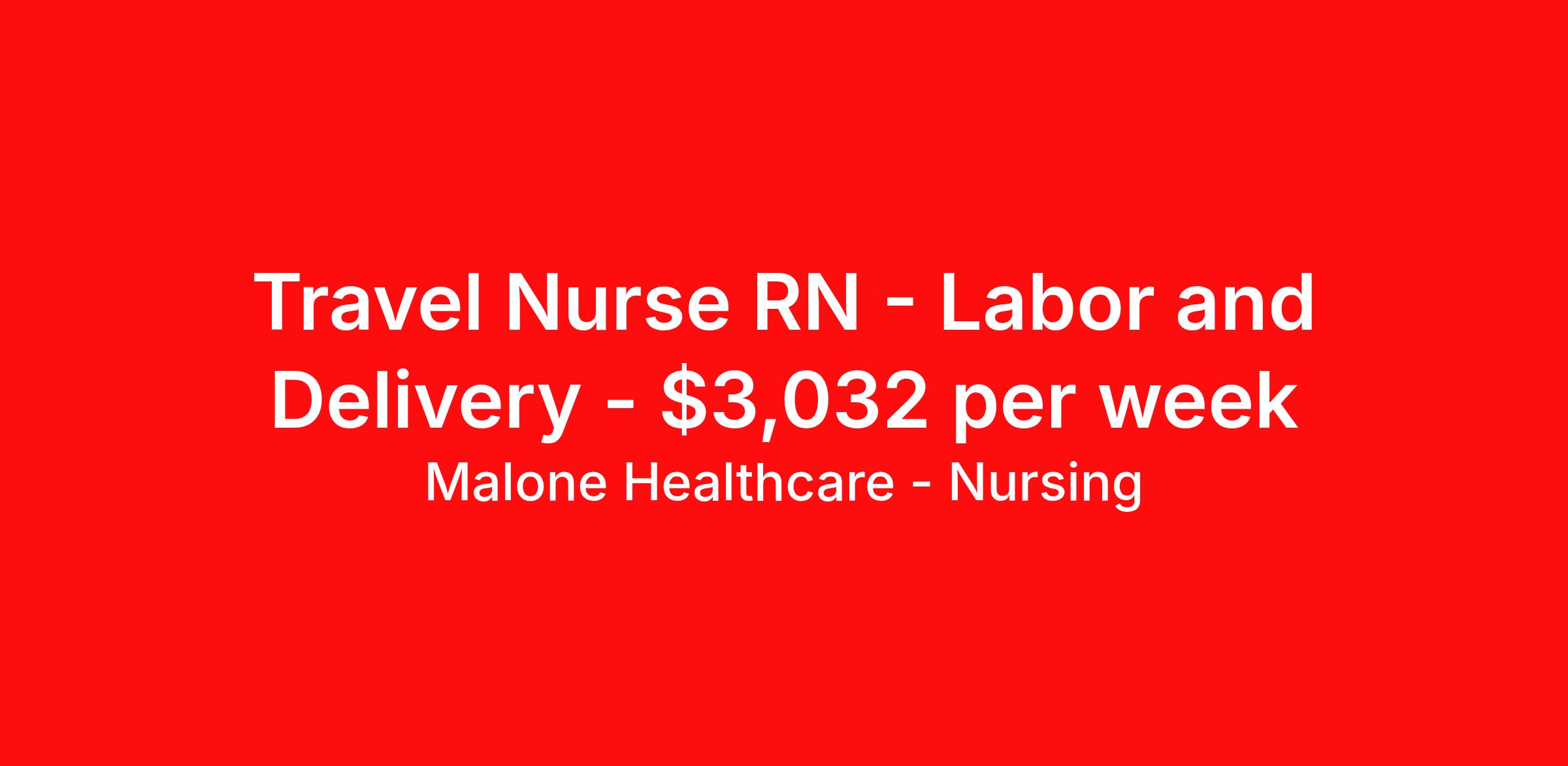 Malone Healthcare - Nursing is seeking a travel nurse RN Labor and Delivery for a travel nursing job in San Francisco, California. Job Description & Requirements Specialty: Labor and Delivery Discipline: RN Start Date: 04/01/2026 Duration: 13 weeks 36 hours per week Shift: 12 hours, nights Employment Type: Travel About Malone Healthcare - Nursing With a commitment to providing a higher standard of service and experience in patient care, Malone Healthcare places expert nurses and allied health professionals in rewarding careers throughout the United States. As a leading healthcare staffing agency, Malone’s focus on compliance and integrity translates to a seamless experience for our team members and partner facilities. When you work with Malone Healthcare, you can rely on over 50 years of proven experience placing exceptional professionals in quality healthcare settings. Benefits Weekly pay Holiday Pay Guaranteed Hours Continuing Education 401k retirement plan Pet insurance Referral bonus Medical benefits Dental benefits Vision benefits License and certification reimbursement Life insurance